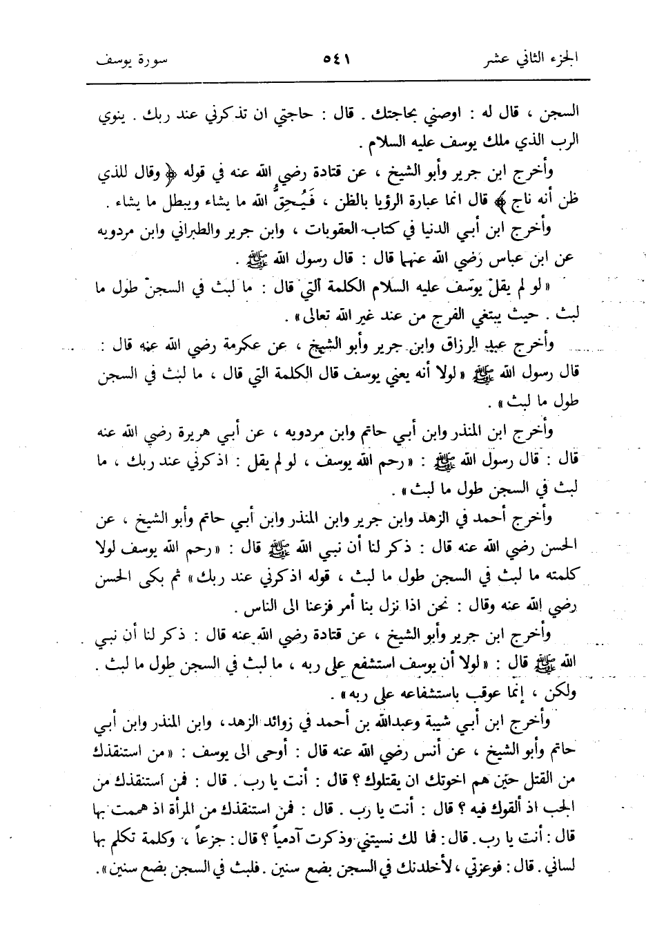 وَأخرج ابْن جرير وَأَبُو الشَّيْخ عَن قَتَادَة رَضِي الله عَنهُ قَالَ: ذكر لنا أَن النَّبِي اله صلى الله عَلَيْهِ وَسلم قَالَ: لَوْلَا أَن يُوسُف استشفع على ربه مَا لبث فِي السجْن طول مَا لبث
