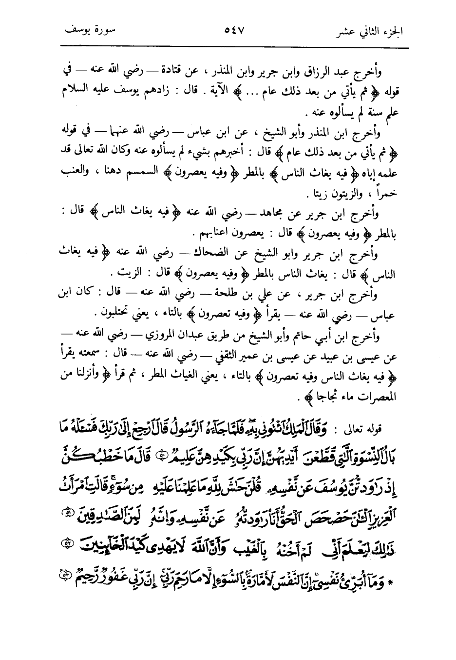 وَأخرج ابْن جرير وَأَبُو الشَّيْخ عَن الضَّحَّاك - رَضِي الله عَنهُ - {فِيهِ يغاث النَّاس} قَالَ: يغاث النَّاس بالمطر {وَفِيه يعصرون} قَالَ: الزَّيْت