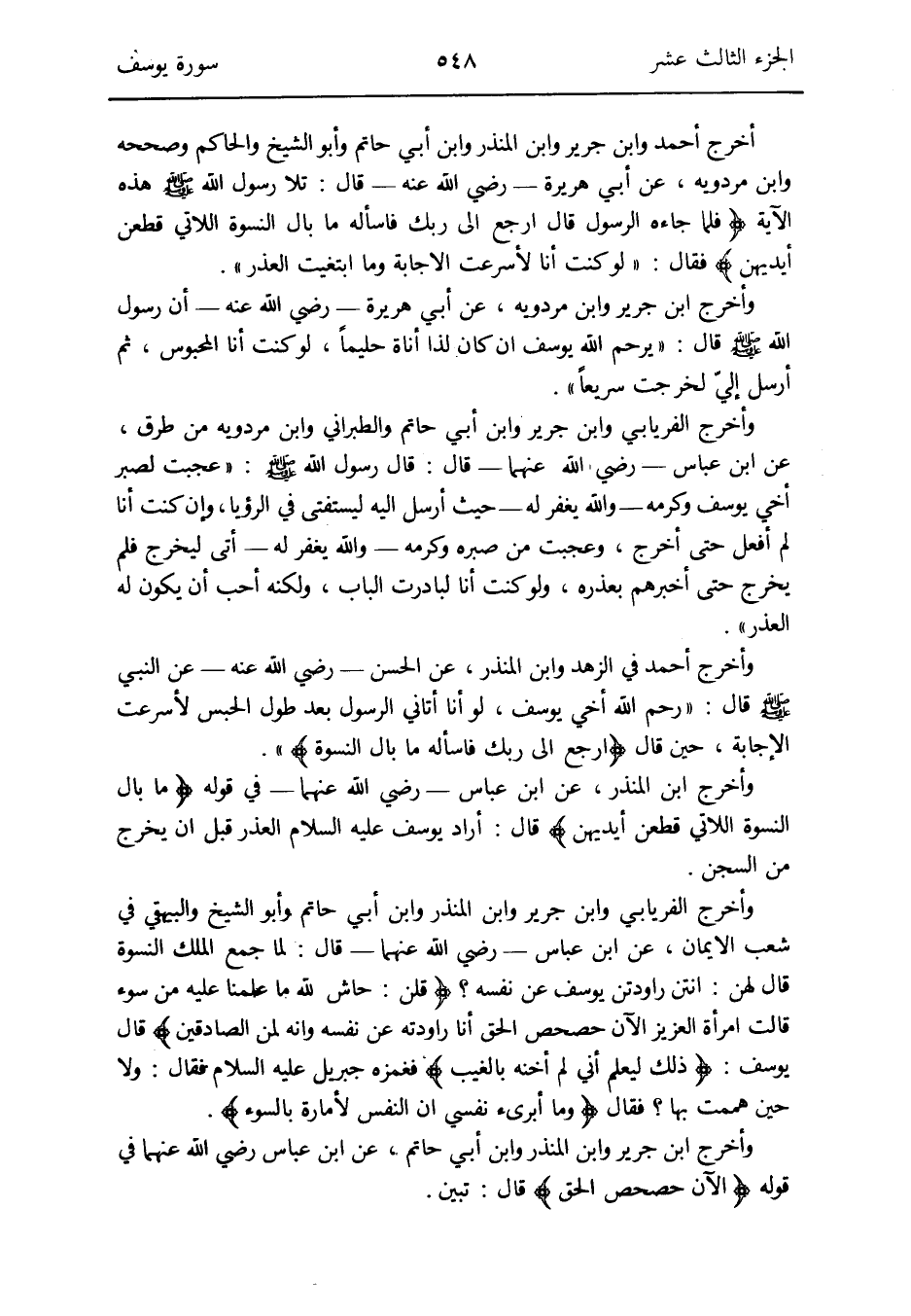 أخرج أَحْمد وَابْن جرير وَابْن الْمُنْذر وَابْن أبي حَاتِم وَأَبُو الشَّيْخ وَالْحَاكِم وَصَححهُ وَابْن مرْدَوَيْه عَن أبي هُرَيْرَة - رَضِي الله عَنهُ - قَالَ: تَلا رَسُول الله صلى الله عَلَيْهِ وَسلم هَذِه الْآيَة {فَلَمَّا جَاءَهُ الرَّسُول قَالَ ارْجع إِلَى رَبك فَاسْأَلْهُ مَا بَال النسْوَة اللَّاتِي قطعن أَيْدِيهنَّ} فَقَالَ: لَو كنت أَنا لَأَسْرَعت الاجابة وَمَا ابْتَغَيْت الْعذر