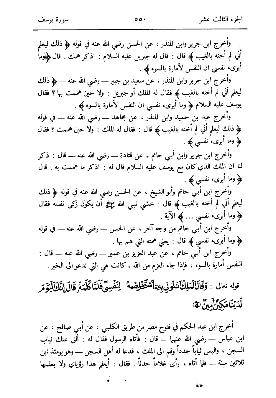 وَأخرج ابْن جرير وَابْن الْمُنْذر عَن سعيد بن جُبَير - رَضِي الله عَنهُ - {ذَلِك ليعلم أَنِّي لم أخنه بِالْغَيْبِ} فَقَالَ لَهُ الْملك أَو جِبْرِيل: وَلَا حِين هَمَمْت بهَا فَقَالَ يُوسُف عَلَيْهِ السَّلَام {وَمَا أبرئ نَفسِي إِن النَّفس لأمارة بالسوء}