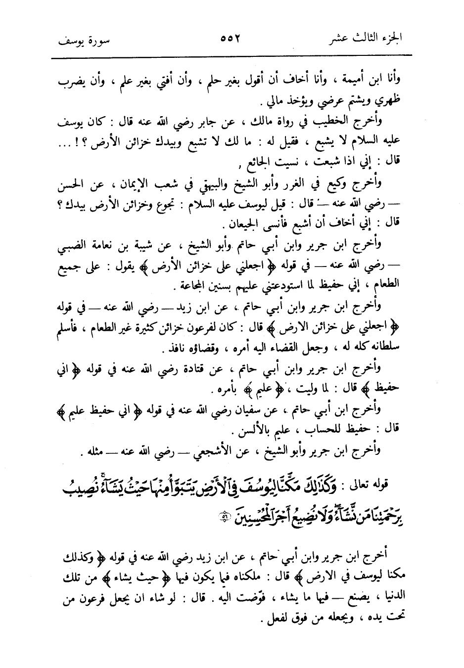 أخرج ابْن جرير وَابْن أبي حَاتِم عَن ابْن زيد رَضِي الله عَنهُ فِي قَوْله {وَكَذَلِكَ مكنا ليوسف فِي الأَرْض} قَالَ: ملكناه فِيمَا يكون فِيهَا {حَيْثُ يَشَاء} من تِلْكَ الدُّنْيَا يصنع - فِيهَا مَا يَشَاء فوّضت إِلَيْهِ