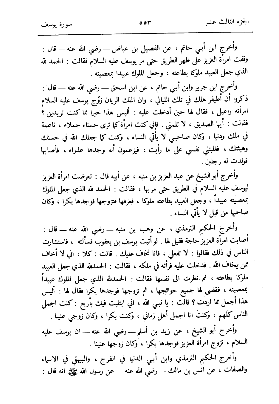 وَأخرج أَبُو الشَّيْخ عَن عبد الْعَزِيز بن مُنَبّه عَن أَبِيه قَالَ: تعرضت امْرَأَة الْعَزِيز ليوسف عَلَيْهِ السَّلَام فِي الطَّرِيق حَتَّى مر بهَا فَقَالَت: الْحَمد لله الَّذِي جعل الْمُلُوك بمعصيته عبيدا وَجعل العبيد بِطَاعَتِهِ ملوكاً فعرفها فَتَزَوجهَا فَوَجَدَهَا بكرا وَكَانَ صَاحبهَا من قبل لَا يَأْتِي النِّسَاء