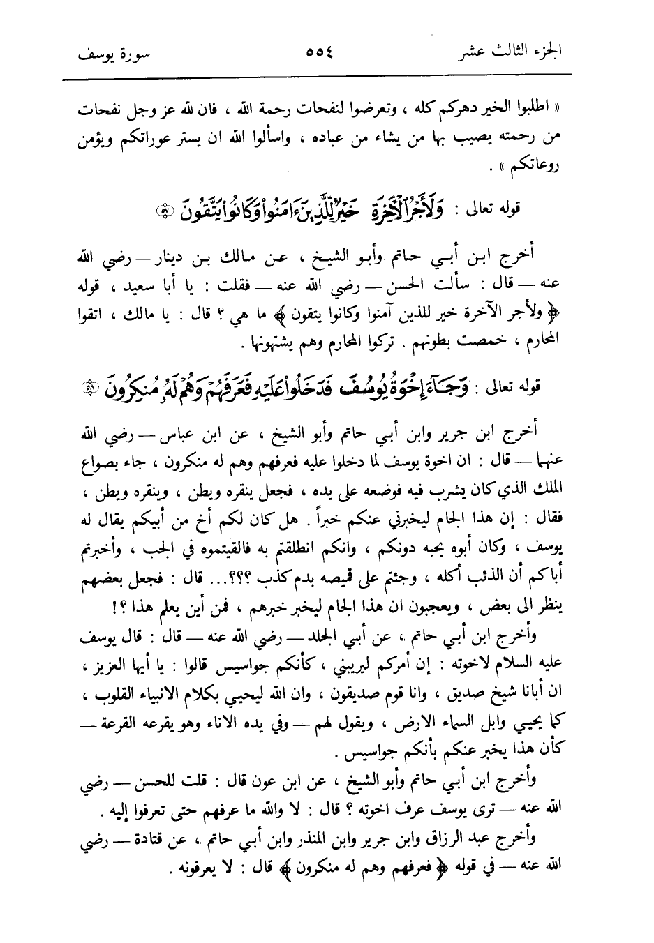 أخرج ابْن أبي حَاتِم وَأَبُو الشَّيْخ عَن مَالك بن دِينَار - رَضِي الله عَنهُ - قَالَ: سَأَلت الْحسن - رَضِي الله عَنهُ - فَقلت: يَا أَبَا سعيد قَوْله {ولأجر الْآخِرَة خير للَّذين آمنُوا وَكَانُوا يَتَّقُونَ} مَا هِيَ قَالَ: يَا مَالك اتَّقوا الْمَحَارِم خمصت بطونهم