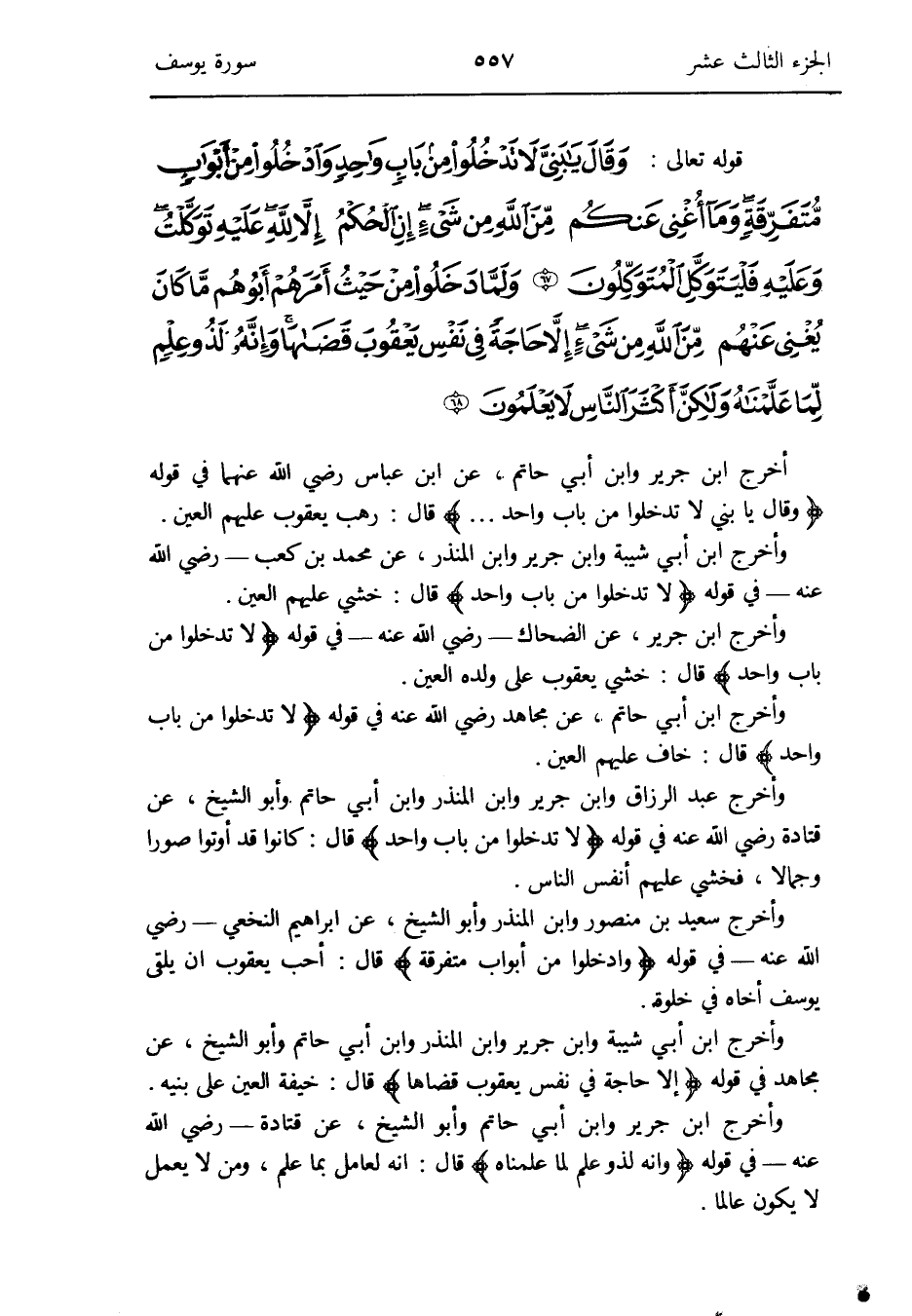 أخرج ابْن جرير وَابْن أبي حَاتِم عَن ابْن عَبَّاس رَضِي الله عَنْهُمَا فِي قَوْله {وَقَالَ يَا بني لَا تدْخلُوا من بَاب وَاحِد} قَالَ: رهب يَعْقُوب عَلَيْهِم الْعين
