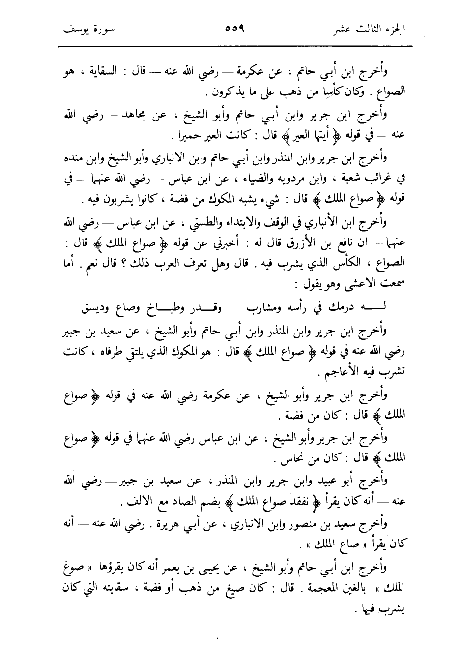 أما سَمِعت الْأَعْشَى وَهُوَ يَقُول: لَهُ درمك فِي رَأسه ومشارب وَقدر وطباخ وَصَاع وديسق وَأخرج ابْن جرير وَابْن الْمُنْذر وَابْن أبي حَاتِم وَأَبُو الشَّيْخ عَن سعيد بن جُبَير رَضِي الله عَنهُ فِي قَوْله {صواع الْملك} قَالَ: هُوَ المكوك الَّذِي يلتقي طرفاه كَانَت تشرب فِيهِ الْأَعَاجِم