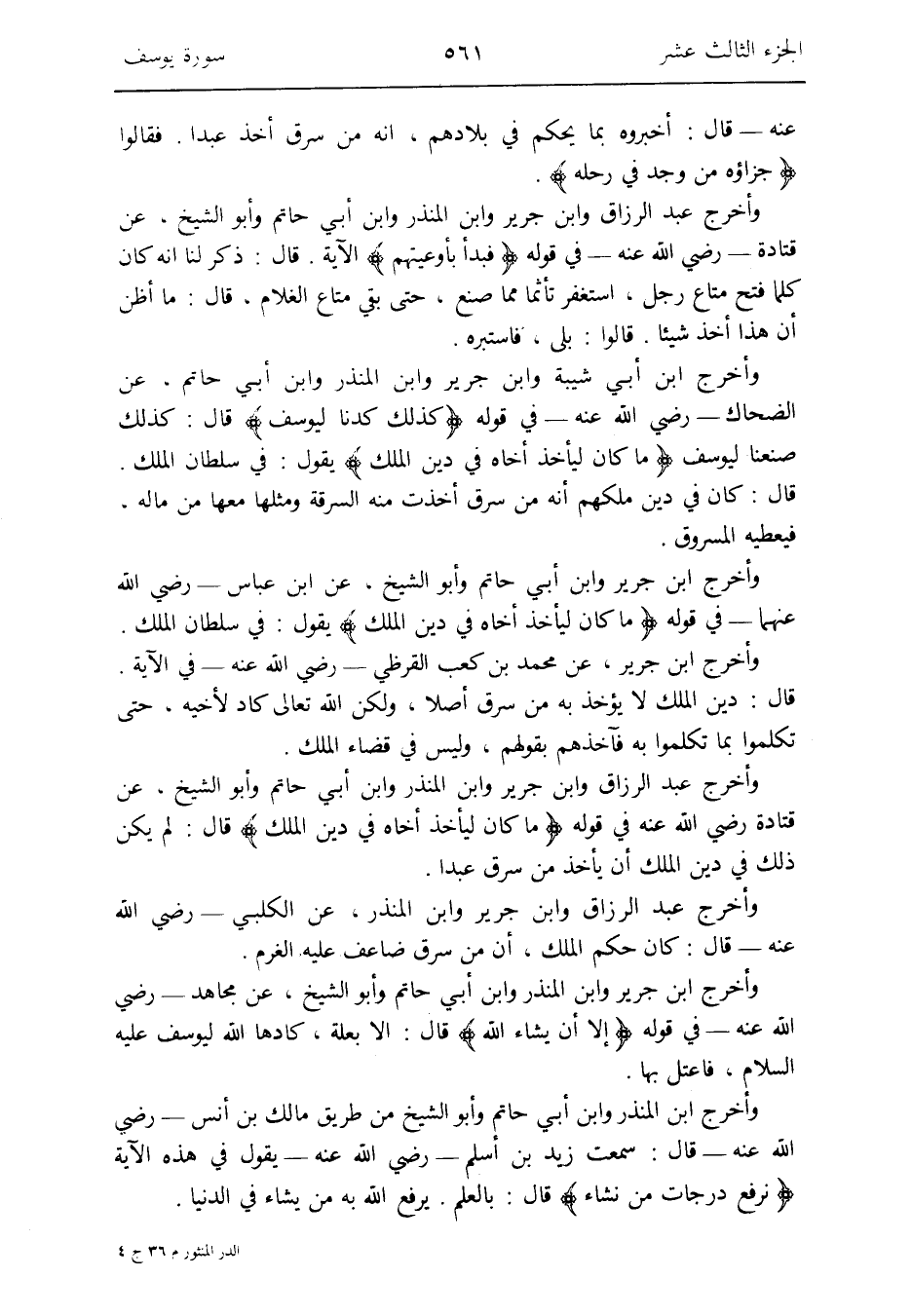 وَأخرج عبد الرَّزَّاق وَابْن جرير وَابْن الْمُنْذر وَابْن أبي حَاتِم وَأَبُو الشَّيْخ عَن قَتَادَة رَضِي الله عَنهُ فِي قَوْله {مَا كَانَ ليَأْخُذ أَخَاهُ فِي دين الْملك} قَالَ: لم يكن ذَلِك فِي دين الْملك أَن يَأْخُذ من سرق عبدا