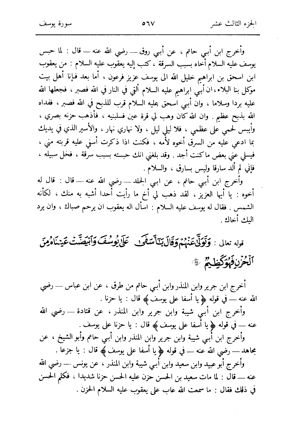 وَأخرج ابْن أبي حَاتِم عَن أبي روق - رَضِي الله عَنهُ - قَالَ: لما حبس يُوسُف عَلَيْهِ السَّلَام أَخَاهُ بِسَبَب السّرقَة كتب إِلَيْهِ يَعْقُوب عَلَيْهِ السَّلَام: من يَعْقُوب ابْن إِسْحَق بن إِبْرَاهِيم خَلِيل الله إِلَى يُوسُف عَزِيز فِرْعَوْن أما بعد فَإنَّا أهل بَيت مُوكل بِنَا الْبلَاء إِن أبي إِبْرَاهِيم عَلَيْهِ السَّلَام ألقِي فِي النَّار فِي الله فَصَبر فَجَعلهَا الله عَلَيْهِ بردا وَسلَامًا وَإِن أبي إِسْحَق عَلَيْهِ السَّلَام قرب للذبح فِي الله فَصَبر فَفَدَاهُ الله بِذبح عَظِيم