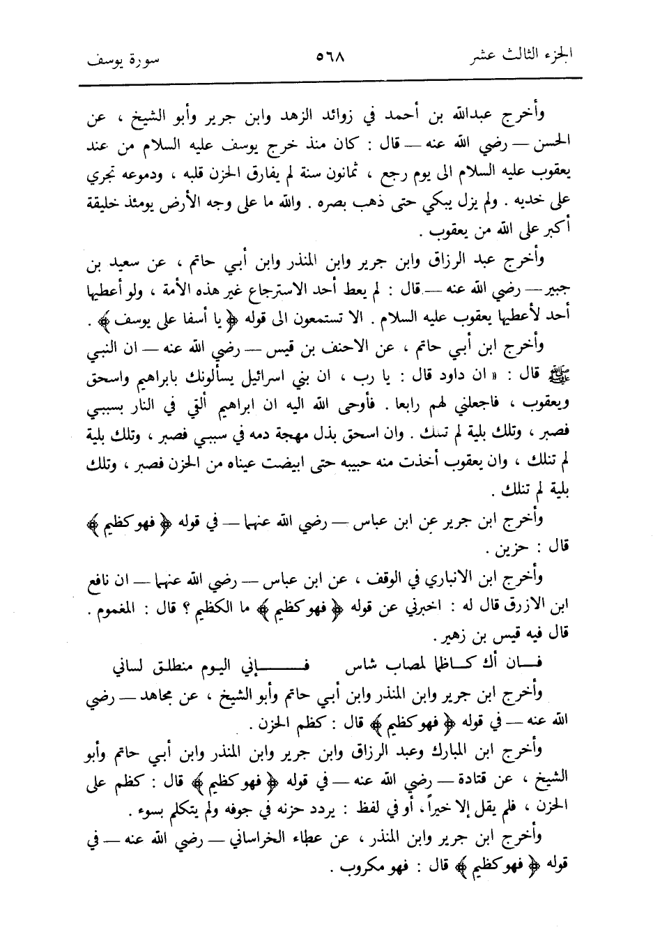 وَأخرج ابْن الْمُبَارك وَعبد الرَّزَّاق وَابْن جرير وَابْن الْمُنْذر وَابْن أبي حَاتِم وَأَبُو الشَّيْخ عَن قَتَادَة - رَضِي الله عَنهُ - فِي قَوْله {فَهُوَ كظيم} قَالَ: كظم على الْحزن فَلم يقل إِلَّا خيرا أَو فِي لفظ: يردد حزنه فِي جَوْفه وَلم يتَكَلَّم بِسوء
