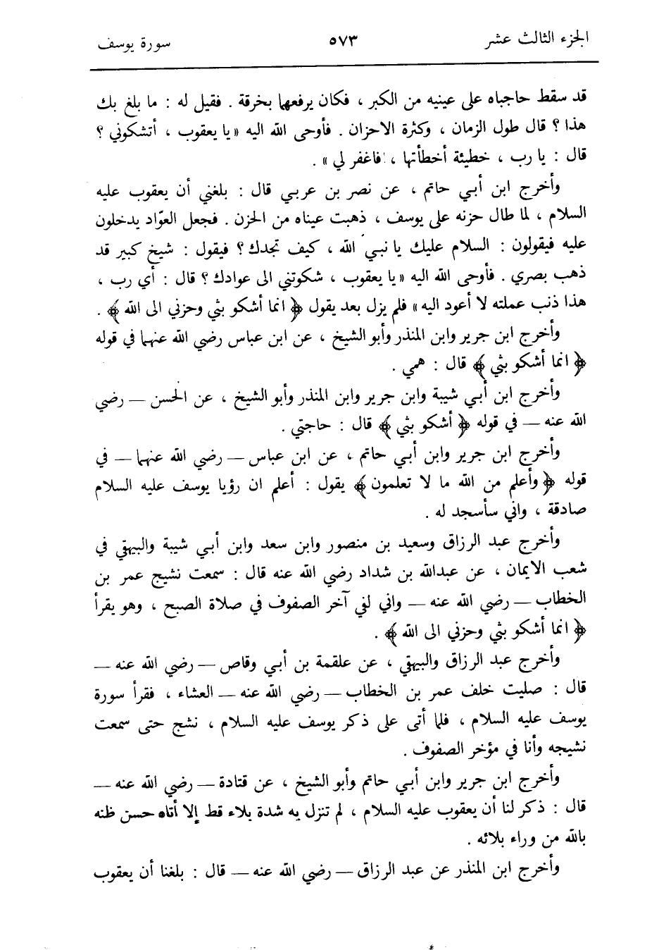 وَأخرج عبد الرَّزَّاق وَالْبَيْهَقِيّ عَن عَلْقَمَة بن أبي وَقاص - رَضِي الله عَنهُ - قَالَ: صليت خلف عمر بن الْخطاب - رَضِي الله عَنهُ - الْعشَاء فَقَرَأَ سُورَة يُوسُف عَلَيْهِ السَّلَام فَلَمَّا أَتَى على ذكر يُوسُف عَلَيْهِ السَّلَام نشج حَتَّى سَمِعت نَشِيجه وَأَنا فِي مُؤخر الصُّفُوف