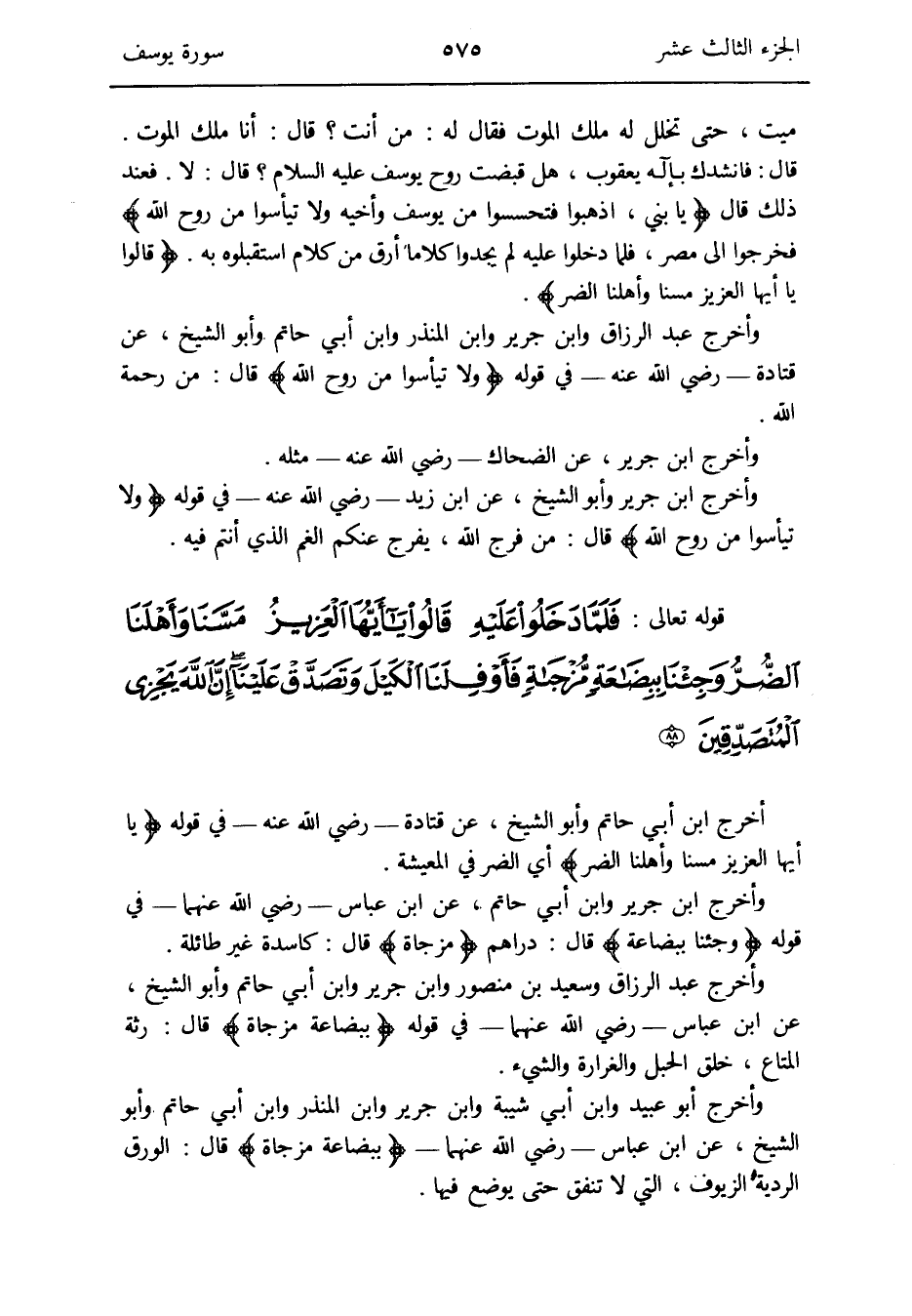 أخرج ابْن أبي حَاتِم وَأَبُو الشَّيْخ عَن قَتَادَة - رَضِي الله عَنهُ - فِي قَوْله {يَا أَيهَا الْعَزِيز مسنا وأهلنا الضّر} أَي الضّر فِي الْمَعيشَة