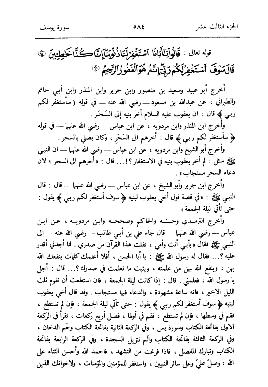 وَأخرج ابْن جرير وَأَبُو الشَّيْخ عَن ابْن عَبَّاس - رَضِي الله عَنْهُمَا - قَالَ: قَالَ النَّبِي صلى الله عَلَيْهِ وَسلم: فِي قصَّة قَول أخي يَعْقُوب لِبَنِيهِ {سَوف أسْتَغْفر لكم رَبِّي} يَقُول: حَتَّى تَأتي لَيْلَة الْجُمُعَة