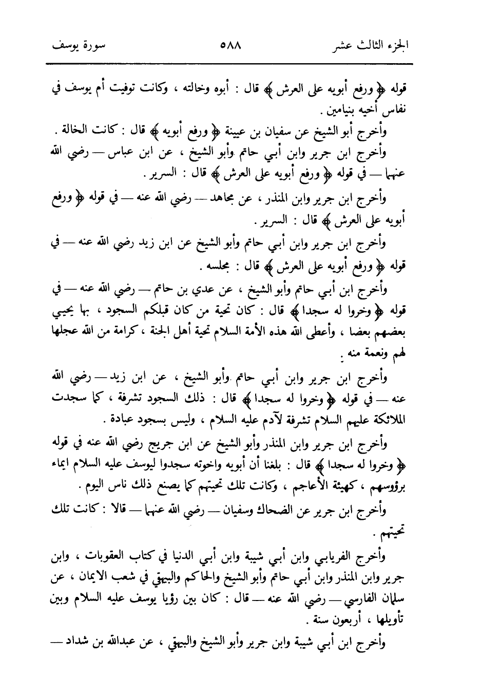 وَأخرج ابْن جرير وَابْن أبي حَاتِم وَأَبُو الشَّيْخ عَن ابْن عَبَّاس - رَضِي الله عَنْهُمَا - فِي قَوْله {وَرفع أَبَوَيْهِ على الْعَرْش} قَالَ: السرير