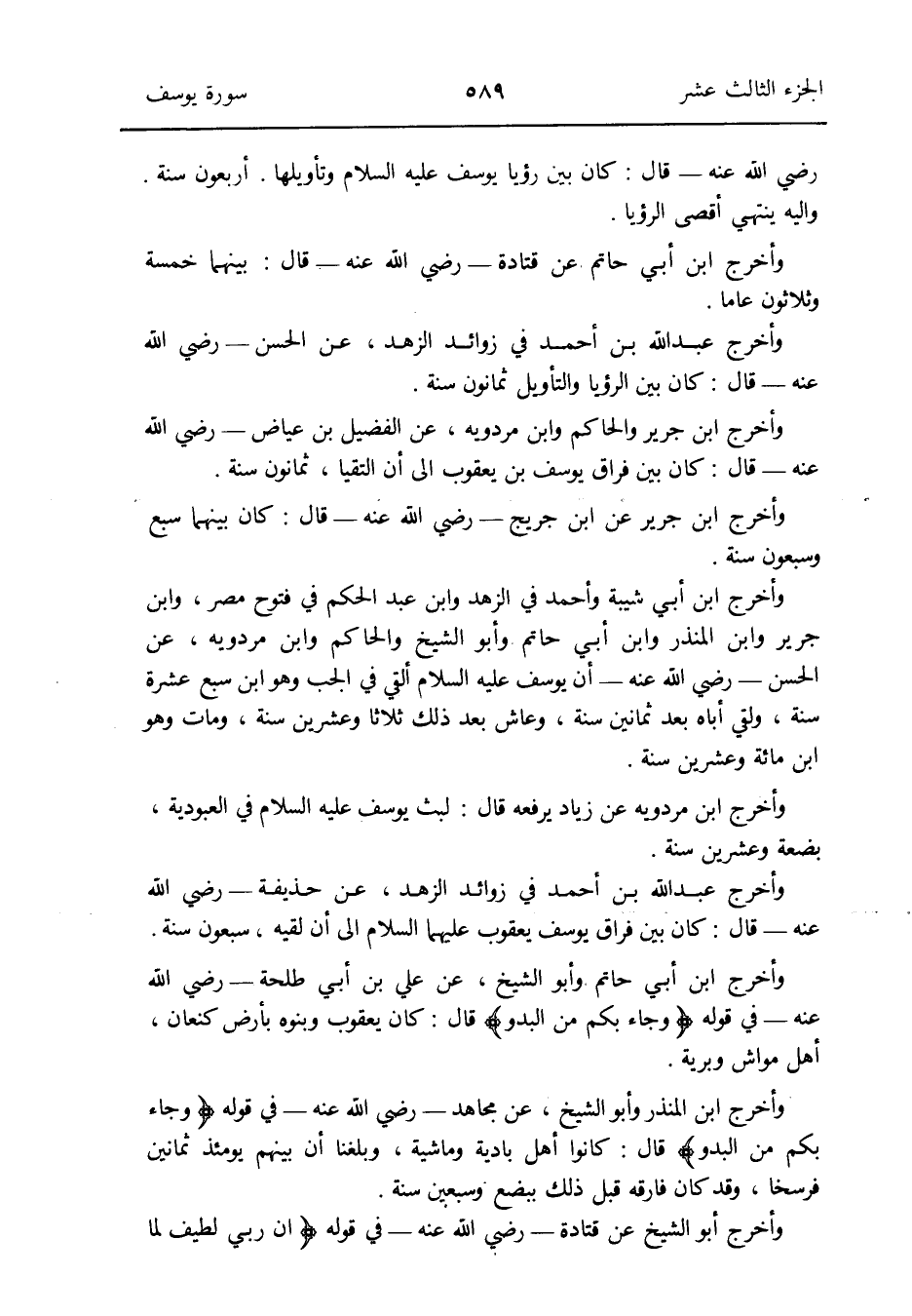 وَأخرج ابْن أبي شيبَة وَأحمد فِي الزّهْد وَابْن عبد الحكم فِي فتوح مصر وَابْن جرير وَابْن الْمُنْذر وَابْن أبي حَاتِم وَأَبُو الشَّيْخ وَالْحَاكِم وَابْن مرْدَوَيْه عَن الْحسن - رَضِي الله عَنهُ - أَن يُوسُف عَلَيْهِ السَّلَام ألقِي فِي الْجب وَهُوَ ابْن سبع عشرَة سنة وَلَقي أَبَاهُ بعد ثَمَانِينَ سنة وعاش بعد ذَلِك ثَلَاثًا وَعشْرين سنة وَمَات وَهُوَ ابْن مائَة وَعشْرين سنة