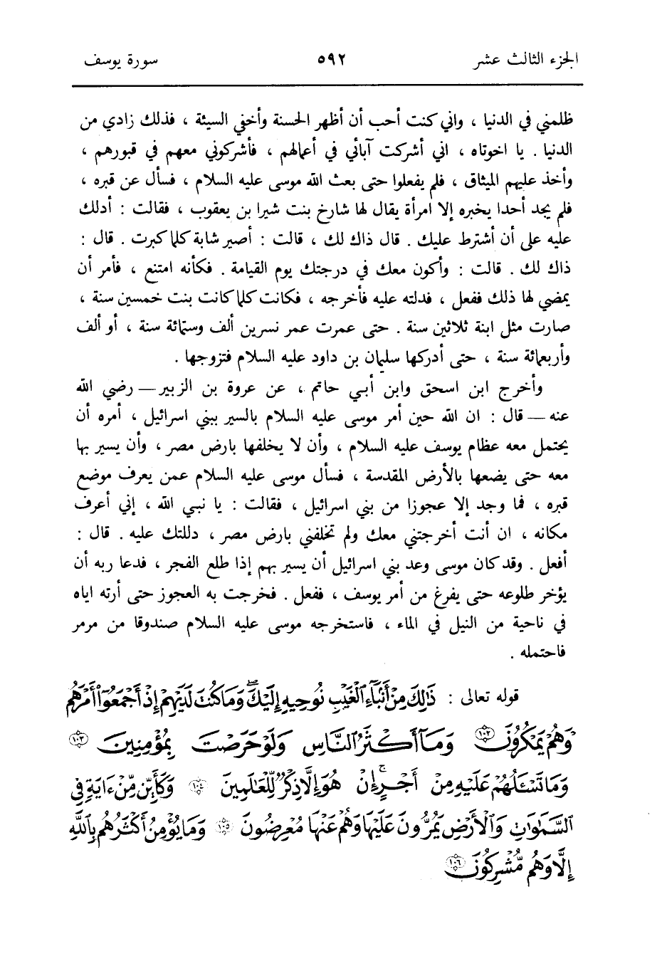 وَأخرج ابْن إِسْحَق وَابْن أبي حَاتِم عَن عُرْوَة بن الزبير - رَضِي الله عَنهُ - قَالَ: إِن الله حِين أَمر مُوسَى عَلَيْهِ السَّلَام بالسير ببني إِسْرَائِيل أمره أَن يحْتَمل مَعَه عِظَام يُوسُف عَلَيْهِ السَّلَام وَأَن لَا يخلفها بِأَرْض مصر وَأَن يسير بهَا حَتَّى يَضَعهَا بِالْأَرْضِ المقدسة فَسَأَلَ مُوسَى عَلَيْهِ السَّلَام عَمَّن يعرف مَوضِع قَبره فَمَا وجد إِلَّا عجوزاً من بني إِسْرَائِيل فَقَالَت: يَا نَبِي الله إِنِّي أعرف مَكَانَهُ إِن أَنْت أخرجتني مَعَك وَلم تخلفني بِأَرْض مصر دللتك عَلَيْهِ