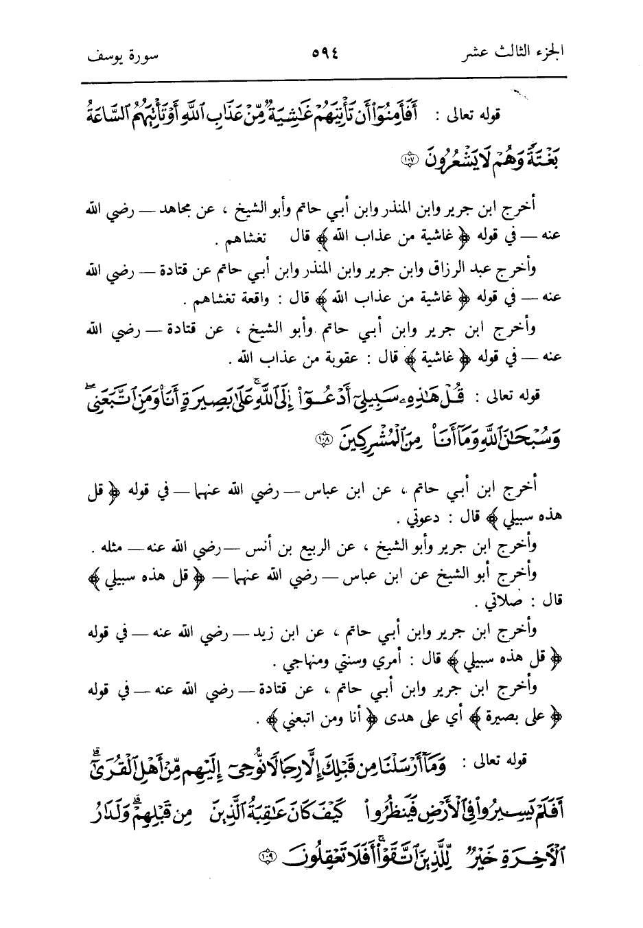 أخرج ابْن أبي حَاتِم عَن ابْن عَبَّاس - رَضِي الله عَنْهُمَا - فِي قَوْله {قل هَذِه سبيلي} قَالَ: دَعْوَتِي