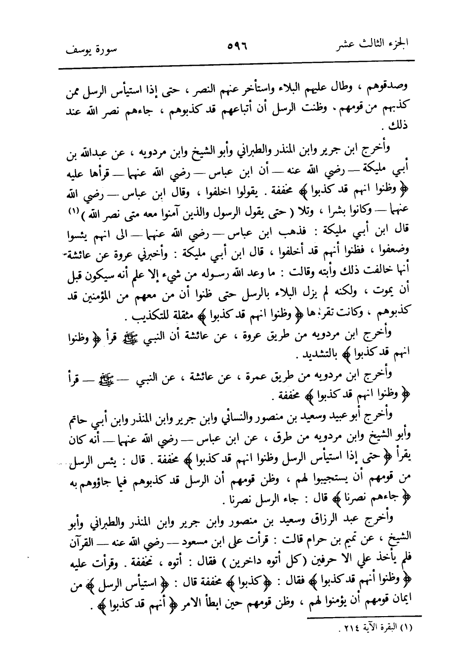 وَأخرج ابْن جرير وَابْن الْمُنْذر وَالطَّبَرَانِيّ وَأَبُو الشَّيْخ وَابْن مرْدَوَيْه عَن عبد الله بن أبي مليكَة - رَضِي الله عَنهُ - أَن ابْن عَبَّاس - رَضِي الله عَنْهُمَا - قَرَأَهَا عَلَيْهِ {وظنوا أَنهم قد كذبُوا} مُخَفّفَة