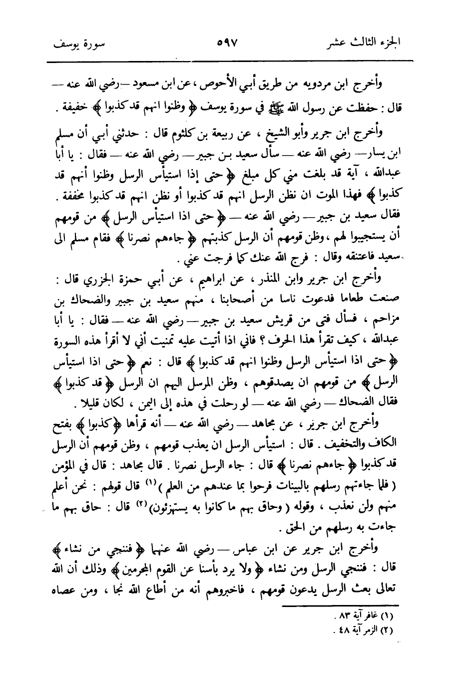 وَأخرج ابْن جرير وَابْن الْمُنْذر عَن إِبْرَاهِيم عَن أبي حَمْزَة الْجَزرِي قَالَ: صنعت طَعَاما فدعوت نَاسا من أَصْحَابنَا مِنْهُم سعيد بن جُبَير وَالضَّحَّاك بن مُزَاحم فَسَأَلَ فَتى من قُرَيْش سعيد بن جُبَير - رَضِي الله عَنهُ - فَقَالَ: يَا أَبَا عبد الله كَيفَ تقْرَأ هَذَا الْحَرْف فَإِنِّي إِذا أتيت عَلَيْهِ تمنيت أَنِّي لَا أَقرَأ هَذِه السُّورَة {حَتَّى إِذا استيأس الرُّسُل وظنوا أَنهم قد كذبُوا} قَالَ: نعم {حَتَّى إِذا استيأس الرُّسُل} من قَومهمْ أَن يصدقوهم وَظن الْمُرْسل إِلَيْهِم أَن الرُّسُل {قد كذبُوا} فَقَالَ الضَّحَّاك - رَضِي الله عَنهُ - لَو رحلت فِي هَذِه إِلَى الْيمن لَكَانَ قَلِيلا
