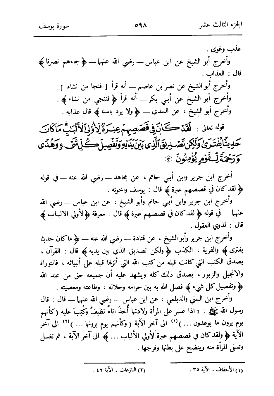 وَأخرج ابْن جرير وَابْن أبي حَاتِم وَأَبُو الشَّيْخ عَن ابْن عَبَّاس - رَضِي الله عَنْهُمَا - فِي قَوْله {لقد كَانَ فِي قصصهم عِبْرَة} قَالَ: معرفَة {لأولي الْأَلْبَاب} قَالَ: لِذَوي الْعُقُول