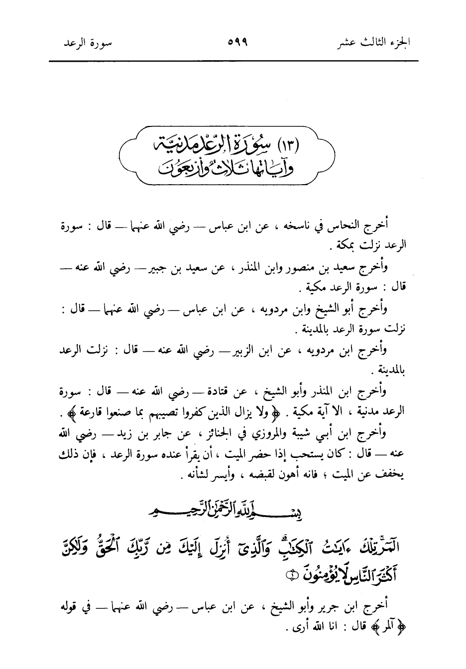 مُقَدّمَة سُورَة الرَّعْد أخرج النّحاس فِي ناسخه عَن ابْن عَبَّاس - رَضِي الله عَنْهُمَا - قَالَ: سُورَة الرَّعْد نزلت بِمَكَّة