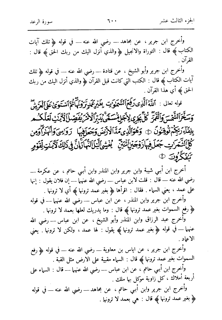 وَأخرج ابْن جرير وَابْن الْمُنْذر عَن ابْن عَبَّاس - رَضِي الله عَنْهُمَا - فِي قَوْله {رفع السَّمَاوَات بِغَيْر عمد ترونها} قَالَ: وَمَا يدْريك لَعَلَّهَا بعمد لَا ترونها