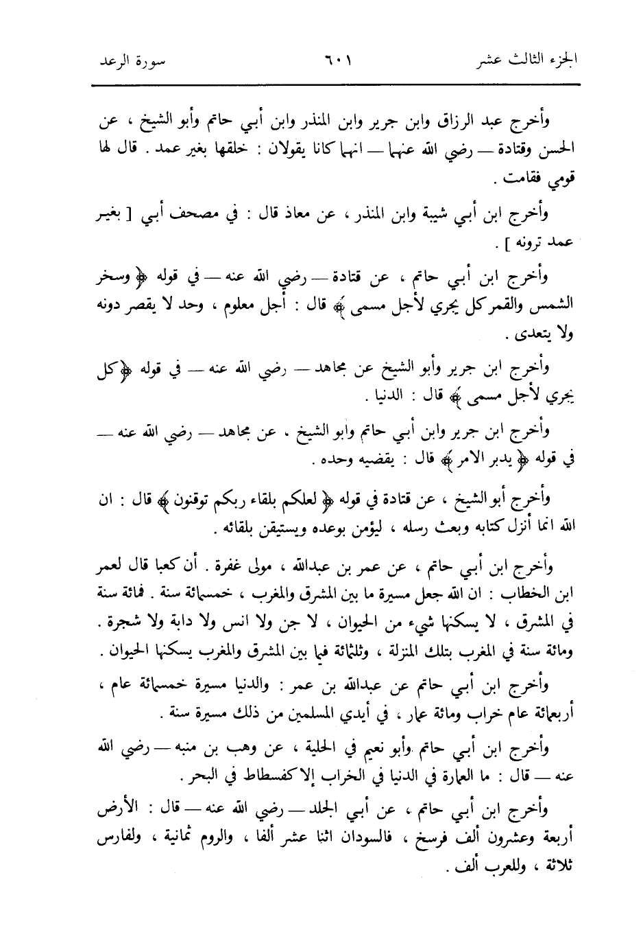 وَأخرج ابْن أبي حَاتِم عَن قَتَادَة - رَضِي الله عَنهُ - فِي قَوْله {وسخر الشَّمْس وَالْقَمَر كل يجْرِي لأجل مُسَمّى} قَالَ: أجل مَعْلُوم وحد لَا يقصر دونه وَلَا يتَعَدَّى