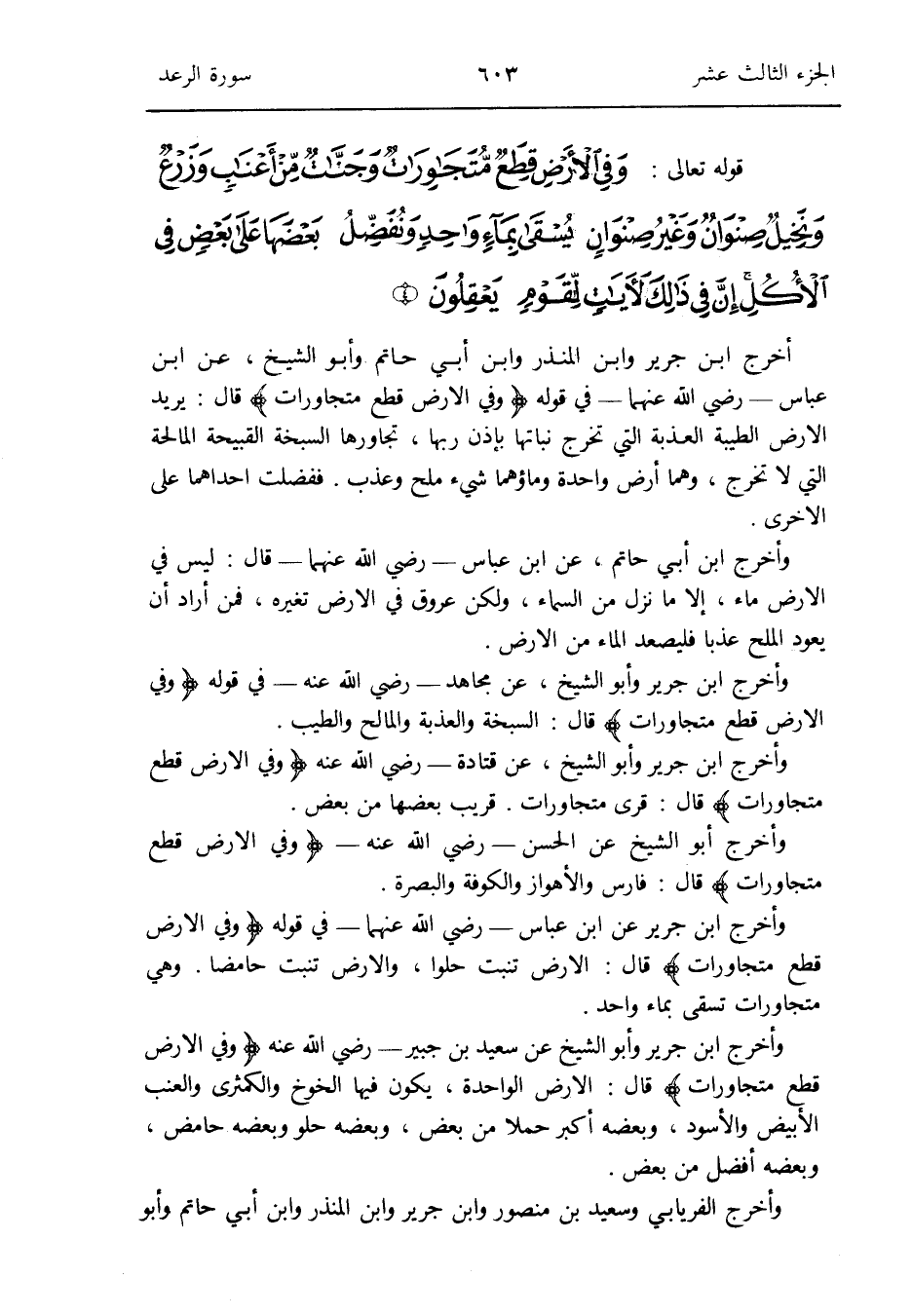 أخرج ابْن جرير وَابْن الْمُنْذر وَابْن أبي حَاتِم وَأَبُو الشَّيْخ عَن ابْن عَبَّاس - رَضِي الله عَنْهُمَا - فِي قَوْله {وَفِي الأَرْض قطع متجاورات} قَالَ: يُرِيد الأَرْض الطّيبَة العذبة الَّتِي تخرج نباتها بِإِذن رَبهَا تجاورها السبخة القبيحة المالحة الَّتِي لَا تخرج وهما أَرض وَاحِدَة وماؤهما شَيْء ملح وعذب