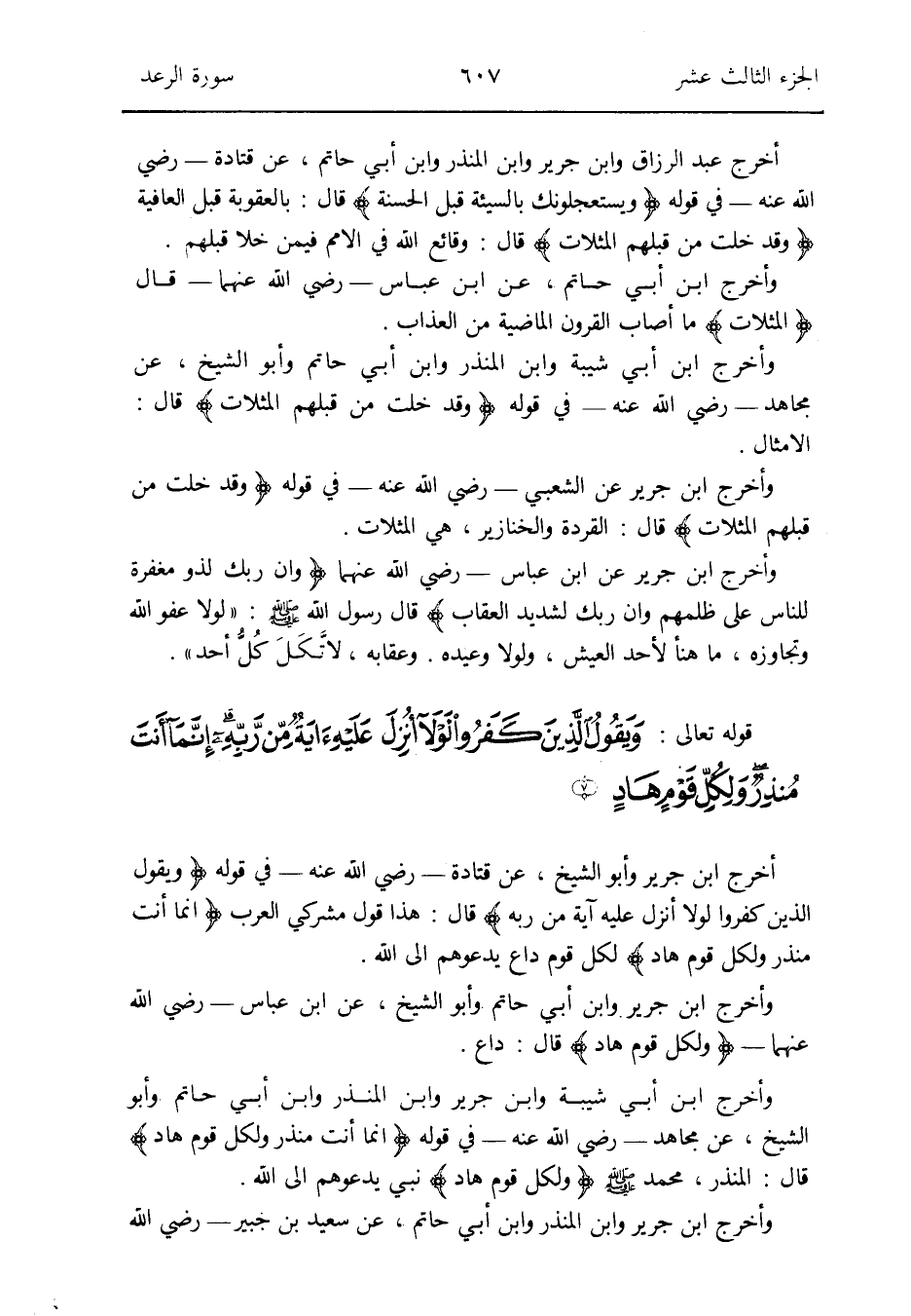 وَأخرج ابْن أبي شيبَة وَابْن جرير وَابْن الْمُنْذر وَابْن أبي حَاتِم وَأَبُو الشَّيْخ عَن مُجَاهِد - رَضِي الله عَنهُ - فِي قَوْله {إِنَّمَا أَنْت مُنْذر وَلكُل قوم هاد} قَالَ: الْمُنْذر مُحَمَّد صلى الله عَلَيْهِ وَسلم {وَلكُل قوم هاد} نَبِي يَدعُوهُم إِلَى الله
