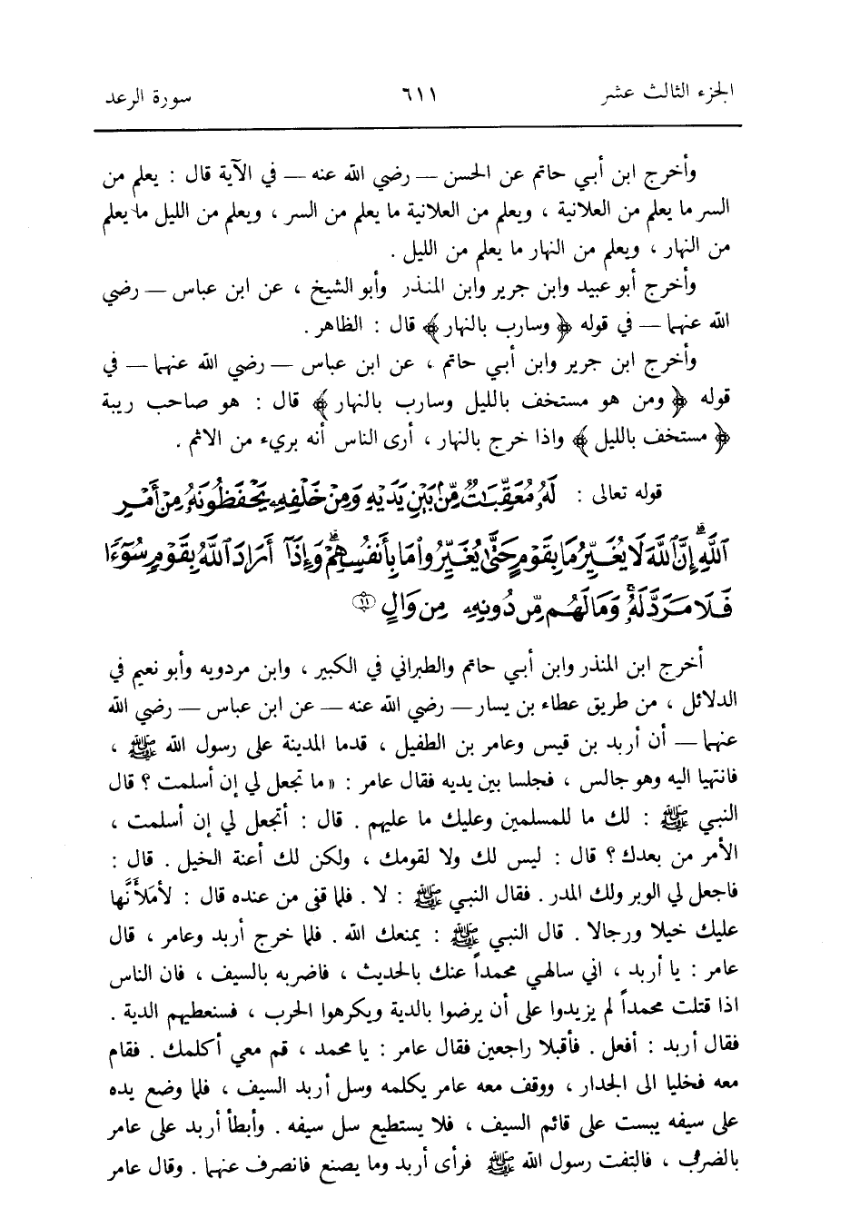 أخرج ابْن الْمُنْذر وَابْن أبي حَاتِم وَالطَّبَرَانِيّ فِي الْكَبِير وَابْن مرْدَوَيْه وَأَبُو نعيم فِي الدَّلَائِل من طَرِيق عَطاء بن يسَار - رَضِي الله عَنهُ - عَن ابْن عَبَّاس - رَضِي الله عَنْهُمَا - أَن أَرْبَد بن قيس وعامر بن الطُّفَيْل قدما الْمَدِينَة على رَسُول الله صلى الله عَلَيْهِ وَسلم فَانْتَهَيَا إِلَيْهِ وَهُوَ جَالس فَجَلَسَا بَين يَدَيْهِ فَقَالَ عَامر: مَا تجْعَل لي إِن أسلمت قَالَ النَّبِي صلى الله عَلَيْهِ وَسلم: لَك مَا للْمُسلمين وَعَلَيْك مَا عَلَيْهِم