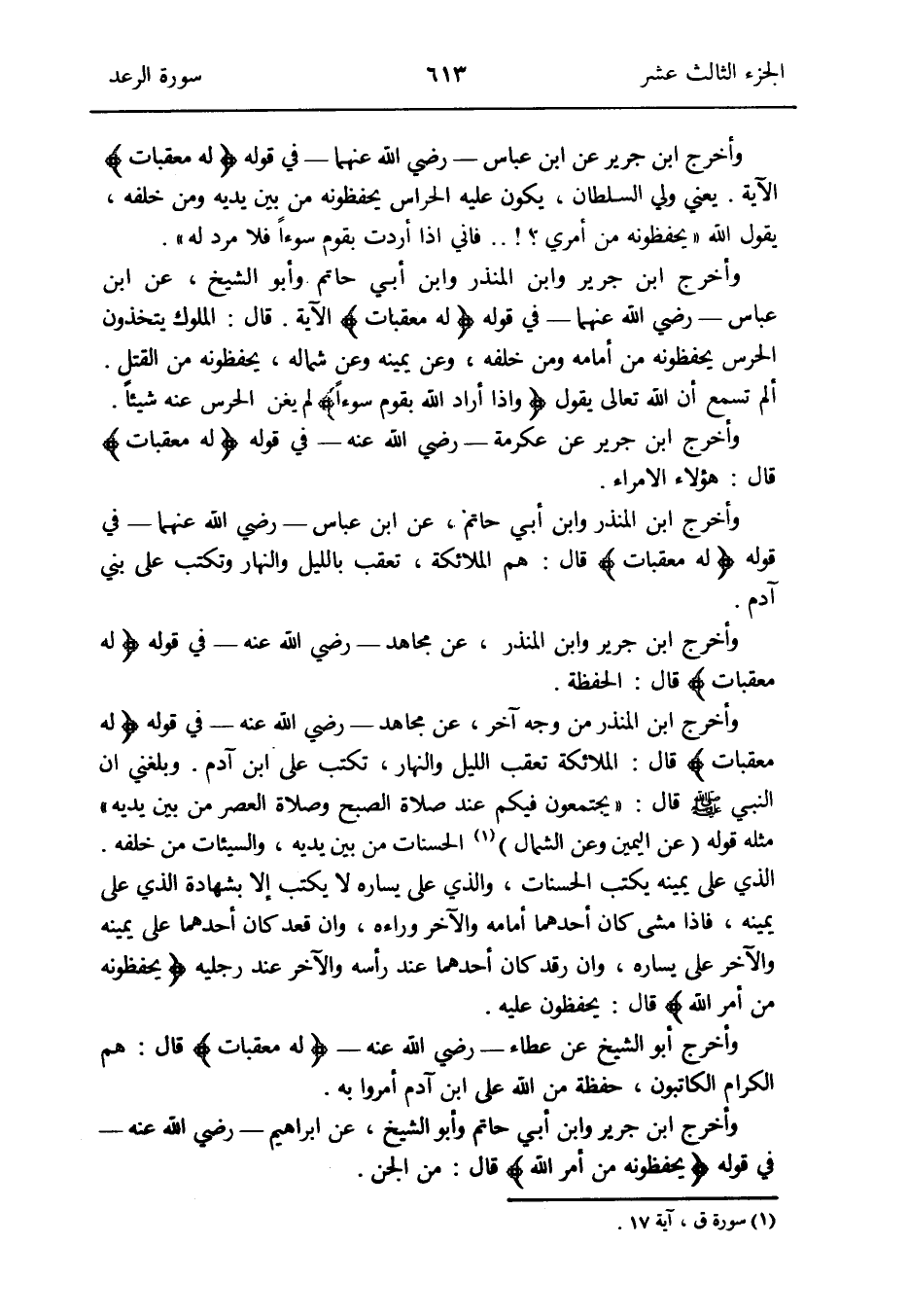 وَأخرج ابْن جرير وَابْن الْمُنْذر وَابْن أبي حَاتِم وَأَبُو الشَّيْخ عَن ابْن عَبَّاس - رَضِي الله عَنْهُمَا - فِي قَوْله {لَهُ مُعَقِّبَات} الْآيَة