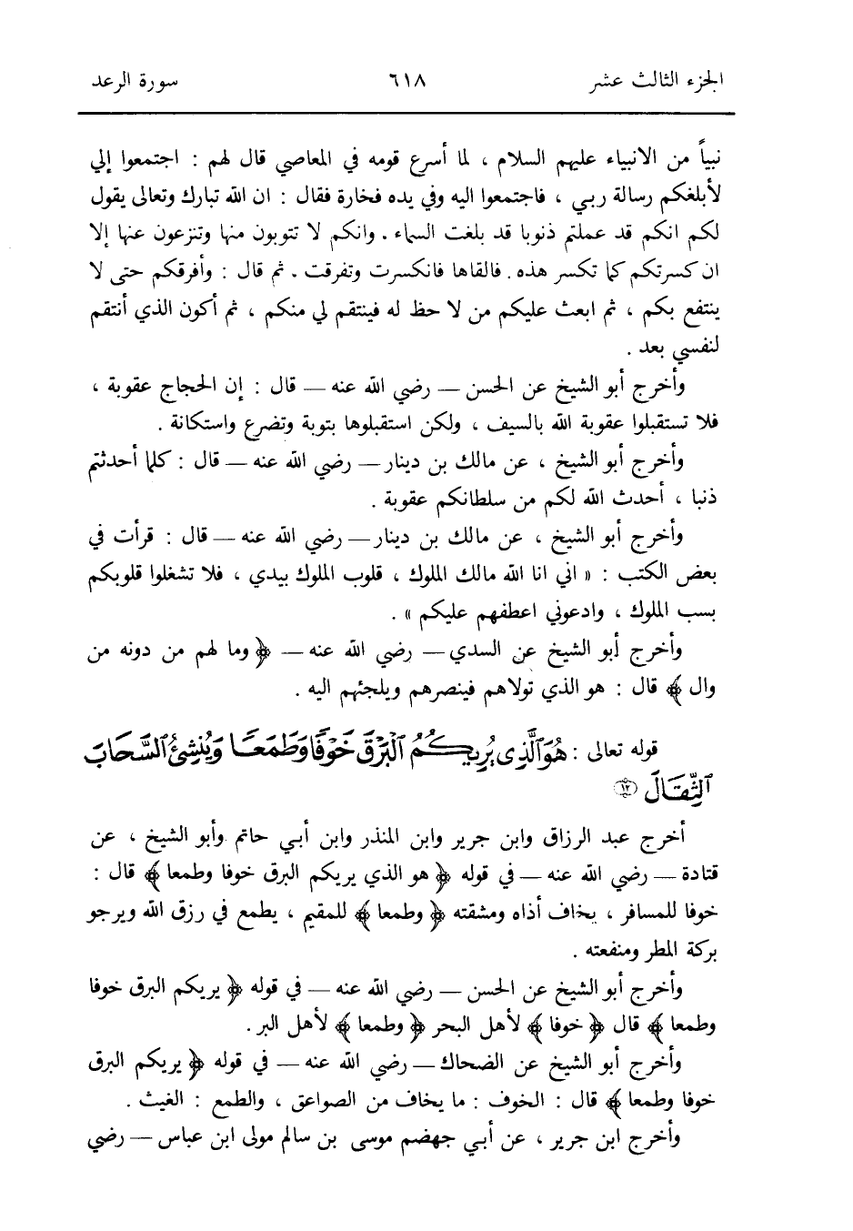 وَأخرج أَبُو الشَّيْخ عَن الْحسن - رَضِي الله عَنهُ - فِي قَوْله {يريكم الْبَرْق خوفًا وَطَمَعًا} قَالَ {خوفًا} لأهل الْبَحْر {وَطَمَعًا} لأهل الْبر