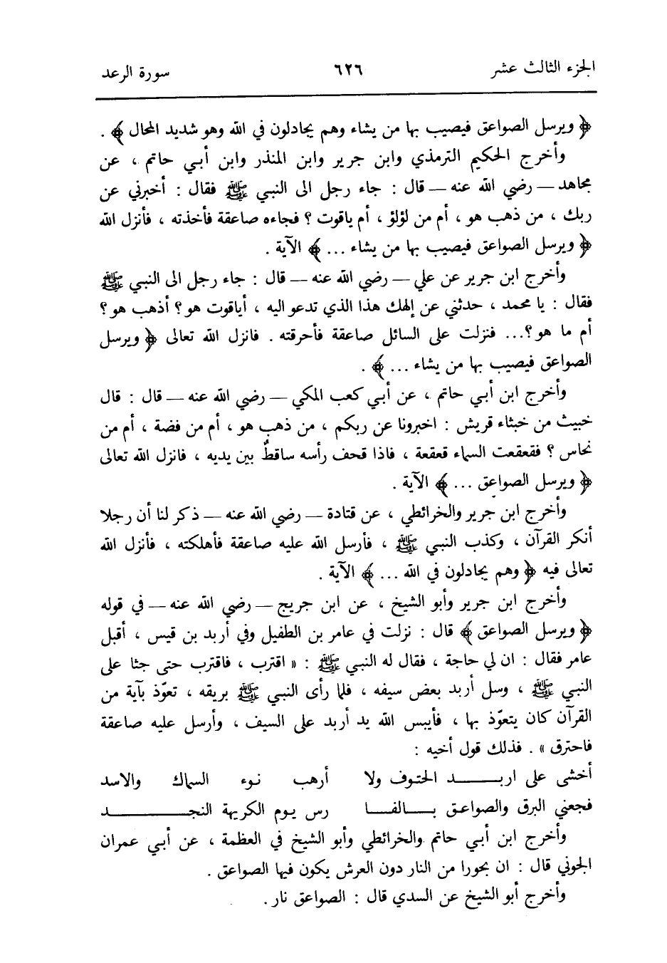 وَأخرج ابْن جرير وَأَبُو الشَّيْخ عَن ابْن جريج - رَضِي الله عَنهُ - فِي قَوْله {وَيُرْسل الصَّوَاعِق} قَالَ: نزلت فِي عَامر بن الطُّفَيْل وَفِي أَرْبَد بن قيس أقبل عَامر فَقَالَ: إِن لي حَاجَة فَقَالَ لَهُ النَّبِي صلى الله عَلَيْهِ وَسلم: اقْترب فاقترب حَتَّى جثا على النَّبِي صلى الله عَلَيْهِ وَسلم وسل أَرْبَد بعض سَيْفه فَلَمَّا رأى النَّبِي صلى الله عَلَيْهِ وَسلم بريقه تعوّذ بِآيَة من الْقُرْآن كَانَ يتعوّذ بهَا فأيبس الله يَد أَرْبَد على السَّيْف وَأرْسل عَلَيْهِ صَاعِقَة فَاحْتَرَقَ