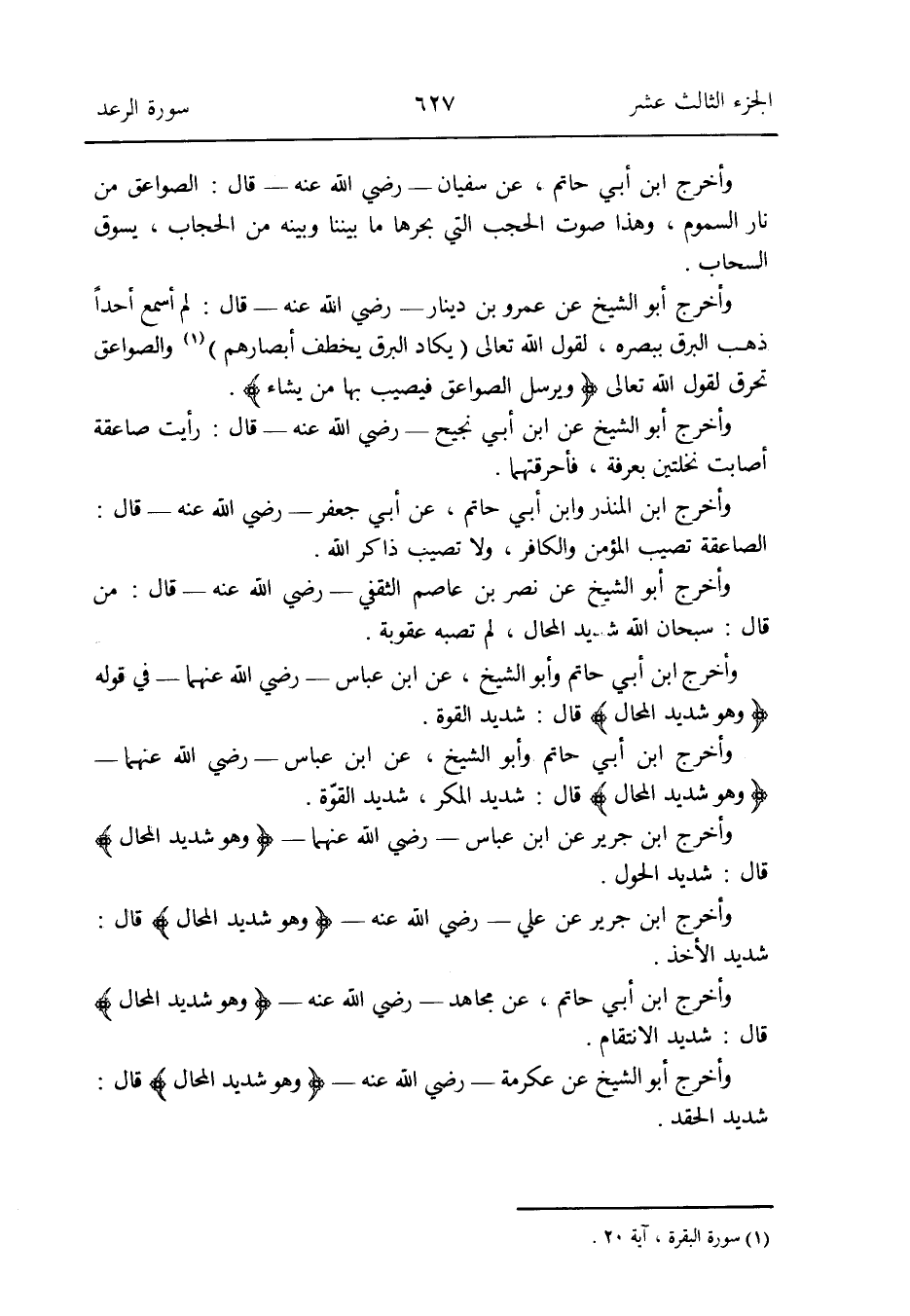 وَأخرج أَبُو الشَّيْخ عَن عَمْرو بن دِينَار - رَضِي الله عَنهُ - قَالَ: لم أسمع أحدا ذهب الْبَرْق ببصره لقَوْل الله تَعَالَى (يكَاد الْبَرْق يخطف أَبْصَارهم) (سُورَة الْبَقَرَة آيَة 20) وَالصَّوَاعِق تحرق لقَوْل الله تَعَالَى {وَيُرْسل الصَّوَاعِق فَيُصِيب بهَا من يَشَاء}