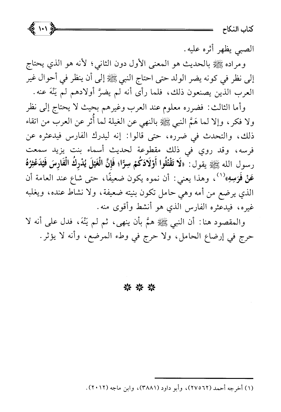 ومراده صلى الله عليه وسلم بالحديث هو المعنى الأول دون الثاني؛ لأنه هو الذي يحتاج إلى نظر في كونه يضر الولد حتى احتاج النبي صلى الله عليه وسلم إلى أن ينظر في أحوال غير العرب الذين يصنعون ذلك، فلما رأى أنه لم يضرَّ أولادهم لم يَنْهَ عنه.