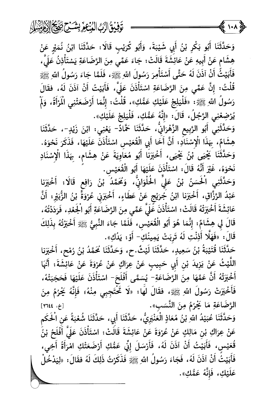 وَحَدَّثَنَا أَبُو بَكْرِ بْنُ أَبِي شَيْبَةَ، وَأَبُو كُرَيْبٍ قَالَا: حَدَّثَنَا ابْنُ نُمَيْرٍ عَنْ هِشَامٍ عَنْ أَبِيهِ عَنْ عَائِشَةَ قَالَتْ: جَاءَ عَمِّي مِنَ الرَّضَاعَةِ يَسْتَأْذِنُ عَلَيَّ، فَأَبَيْتُ أَنْ آذَنَ لَهُ حَتَّى أَسْتَأْمِرَ رَسُولَ اللهِ صلى الله عليه وسلم، فَلَمَّا جَاءَ رَسُولُ اللهِ صلى الله عليه وسلم قُلْتُ: إِنَّ عَمِّي مِنَ الرَّضَاعَةِ اسْتَأْذَنَ عَلَيَّ، فَأَبَيْتُ أَنْ آذَنَ لَهُ، فقَالَ رَسُولُ اللهِ صلى الله عليه وسلم: ((فَلْيَلِجْ عَلَيْكِ عَمُّكِ))، قُلْتُ: إِنَّمَا أَرْضَعَتْنِي الْمَرْأَةُ، وَلَمْ يُرْضِعْنِي الرَّجُلُ، قَالَ: ((إِنَّهُ عَمُّكِ، فَلْيَلِجْ عَلَيْكِ)).