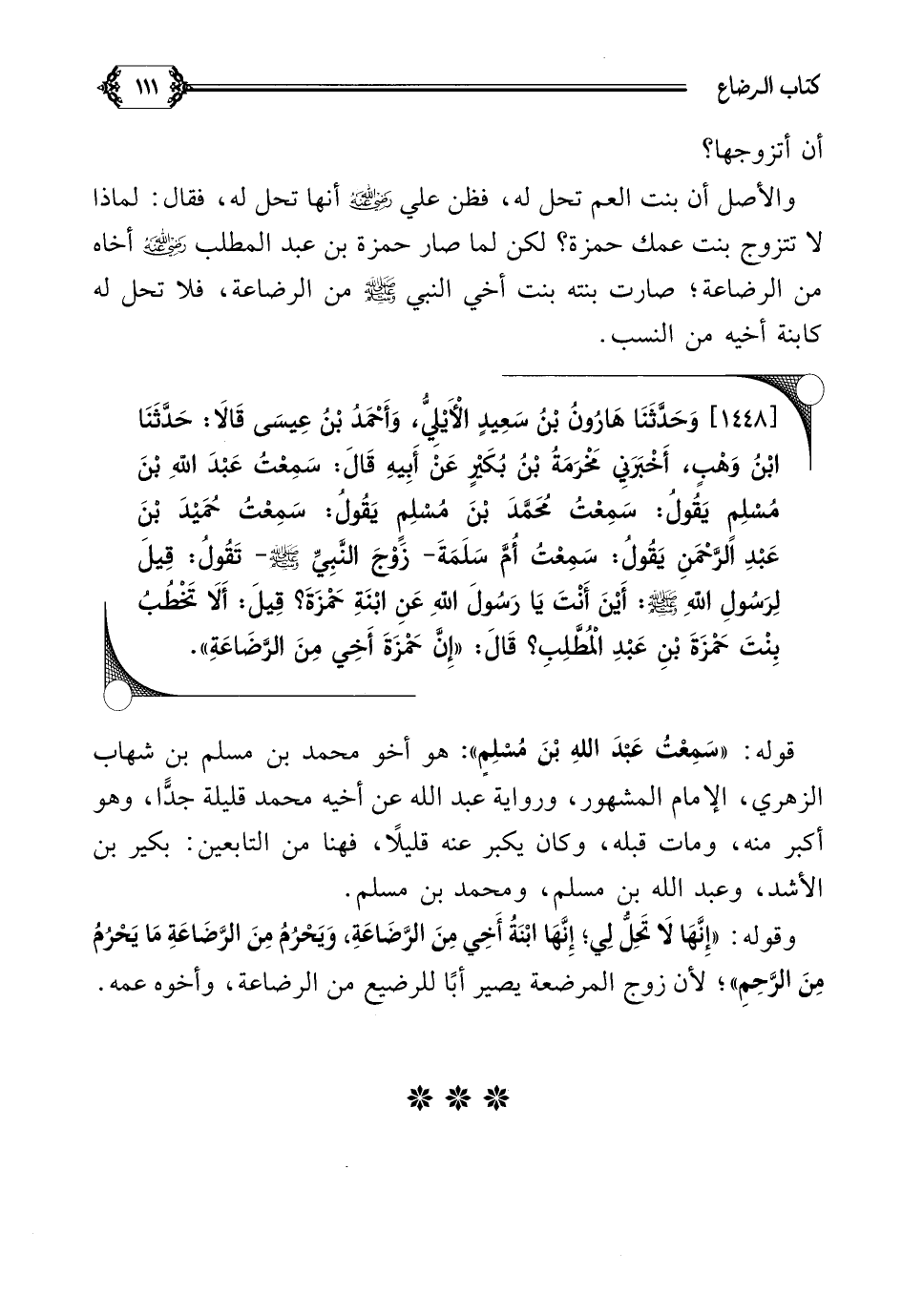 [١٤٤٨] وَحَدَّثَنَا هَارُونُ بْنُ سَعِيدٍ الْأَيْلِيُّ، وَأَحْمَدُ بْنُ عِيسَى قَالَا: حَدَّثَنَا ابْنُ وَهْبٍ، أَخْبَرَنِي مَخْرَمَةُ بْنُ بُكَيْرٍ عَنْ أَبِيهِ قَالَ: سَمِعْتُ عَبْدَ اللهِ بْنَ مُسْلِمٍ يَقُولُ: سَمِعْتُ مُحَمَّدَ بْنَ مُسْلِمٍ يَقُولُ: سَمِعْتُ حُمَيْدَ بْنَ عَبْدِ الرَّحْمَنِ يَقُولُ: سَمِعْتُ أُمَّ سَلَمَةَ- زَوْجَ النَّبِيِّ صلى الله عليه وسلم- تَقُولُ: قِيلَ لِرَسُولِ اللهِ صلى الله عليه وسلم: أَيْنَ أَنْتَ يَا رَسُولَ اللهِ عَنِ ابْنَةِ حَمْزَةَ؟ قِيلَ: أَلَا تَخْطُبُ بِنْتَ حَمْزَةَ بْنِ عَبْدِ الْمُطَّلِبِ؟ قَالَ: ((إِنَّ حَمْزَةَ أَخِي مِنَ الرَّضَاعَةِ)).