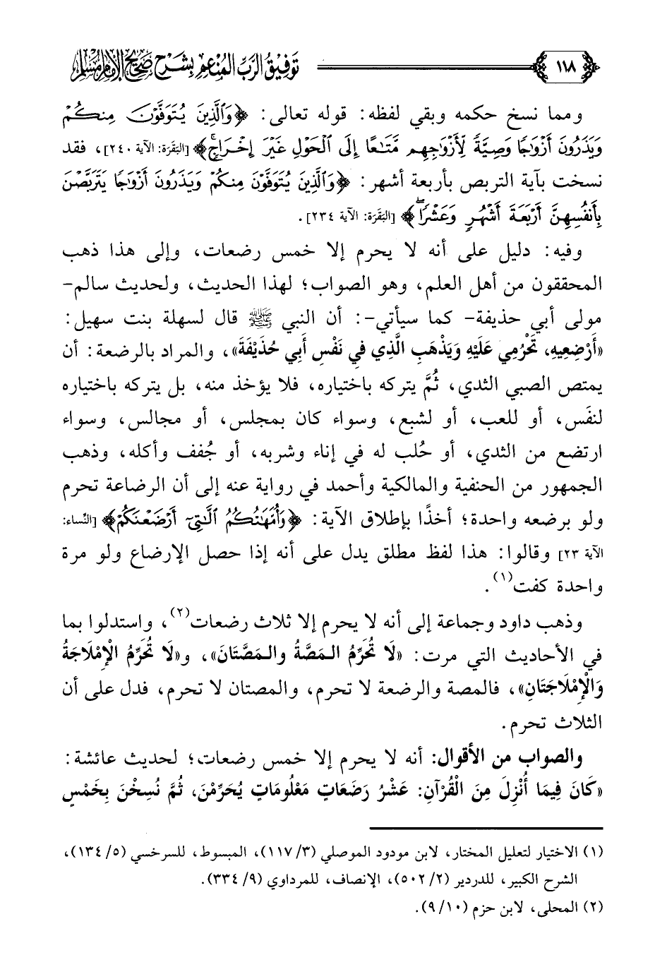 وفيه: دليل على أنه لا يحرم إلا خمس رضعات، وإلى هذا ذهب المحققون من أهل العلم، وهو الصواب؛ لهذا الحديث، والمراد بالرضعة: أن يمتص الصبي الثدي، ثُمَّ يتركه باختياره، بل يتركه باختياره لنفَس، أو للعب، أو لشبع، وسواء كان بمجلس، أو مجالس، وسواء ارتضع من الثدي، أو حُلب له في إناء وشربه، أو جُفف وأكله، وذهب الجمهور من الحنفية والمالكية وأحمد في رواية عنه إلى أن الرضاعة تحرم ولو برضعه واحدة؛ أخذًا بإطلاق الآية: {وَأُمَّهَاتُكُمُ اللَّاتِي أَرْضَعْنَكُمْ} وقالوا: هذا لفظ مطلق يدل على أنه إذا حصل الإرضاع ولو مرة واحدة كفت (¬١).