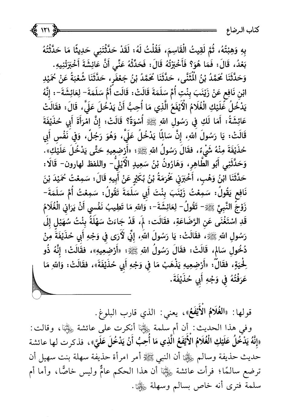وفي هذا الحديث: أن أم سلمة رضي الله عنها أنكرت على عائشة رضي الله عنها، وقالت: ((إِنَّهُ يَدْخُلُ عَلَيْكِ الْغُلَامُ الْأَيْفَعُ الَّذِي مَا أُحِبُّ أَنْ يَدْخُلَ عَلَيَّ)) فذكرت لها عائشة حديث حذيفة وسالم رضي الله عنهما أن النبي صلى الله عليه وسلم أمر امرأة حذيفة سهلة بنت سهيل أن ترضع سالمًا؛ فرأت عائشة رضي الله عنها أن هذا الحكم عامٌّ وليس خاصًّا، وأما أم سلمة فترى أنه خاص بسالم وسهلة رضي الله عنهما.