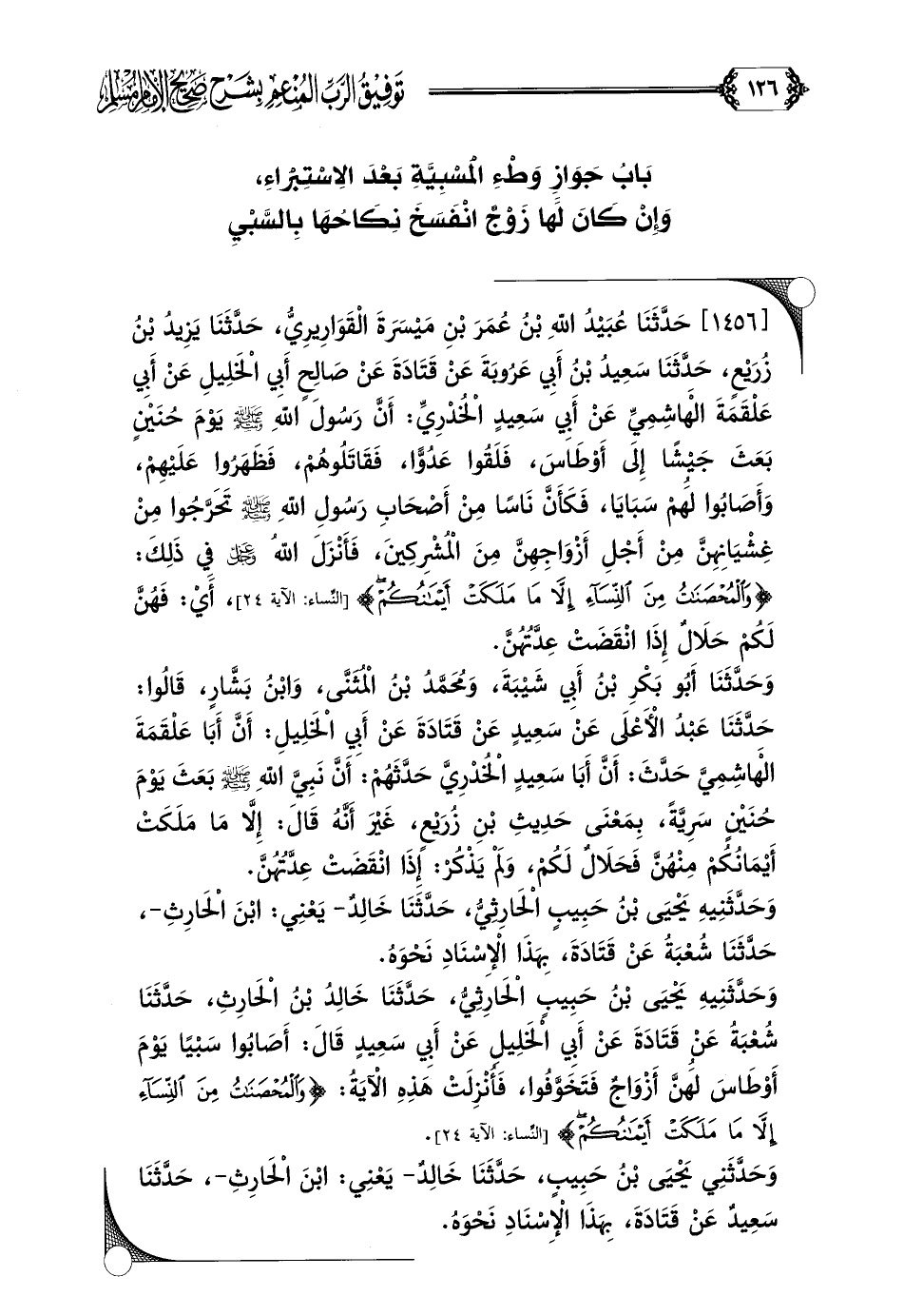 [١٤٥٦] حَدَّثَنَا عُبَيْدُ اللهِ بْنُ عُمَرَ بْنِ مَيْسَرَةَ الْقَوَارِيرِيُّ، حَدَّثَنَا يَزِيدُ بْنُ زُرَيْعٍ، حَدَّثَنَا سَعِيدُ بْنُ أَبِي عَرُوبَةَ عَنْ قَتَادَةَ عَنْ صَالِحٍ أَبِي الْخَلِيلِ عَنْ أَبِي عَلْقَمَةَ الْهَاشِمِيِّ عَنْ أَبِي سَعِيدٍ الْخُدْرِيِّ: أَنَّ رَسُولَ اللهِ صلى الله عليه وسلم يَوْمَ حُنَيْنٍ بَعَثَ جَيْشًا إِلَى أَوْطَاسَ، فَلَقُوا عَدُوًّا، فَقَاتَلُوهُمْ، فَظَهَرُوا عَلَيْهِمْ، وَأَصَابُوا لَهُمْ سَبَايَا، فَكَأَنَّ نَاسًا مِنْ أَصْحَابِ رَسُولِ اللهِ صلى الله عليه وسلم تَحَرَّجُوا مِنْ غِشْيَانِهِنَّ مِنْ أَجْلِ أَزْوَاجِهِنَّ مِنَ الْمُشْرِكِينَ، فَأَنْزَلَ اللهُ عز وجل فِي ذَلِكَ: {وَالْمُحْصَنَاتُ مِنَ النِّسَاءِ إِلا مَا مَلَكَتْ أَيْمَانُكُمْ}، أَيْ: فَهُنَّ لَكُمْ حَلَالٌ إِذَا انْقَضَتْ عِدَّتُهُنَّ.
