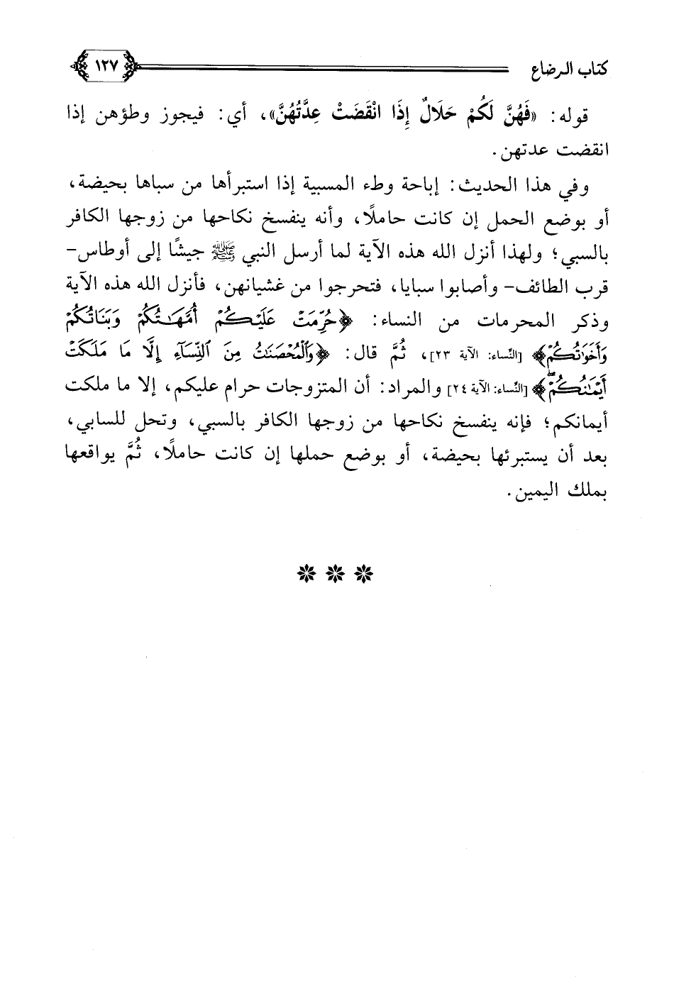 وفي هذا الحديث: إباحة وطء المسبية إذا استبرأها من سباها بحيضة، أو بوضع الحمل إن كانت حاملًا، وأنه ينفسخ نكاحها من زوجها الكافر بالسبي؛ ولهذا أنزل الله هذه الآية لما أرسل النبي صلى الله عليه وسلم جيشًا إلى أوطاس- قرب الطائف- وأصابوا سبايا، فتحرجوا من غشيانهن، فأنزل الله هذه الآية وذكر المحرمات من النساء: {حُرِّمَتْ عَلَيْكُمْ أُمَّهَاتُكُمْ وَبَنَاتُكُمْ وَأَخَوَاتُكُمْ}، ثُمَّ قال: {وَالْمُحْصَنَاتُ مِنَ النِّسَاءِ إِلَّا مَا مَلَكَتْ أَيْمَانُكُمْ} والمراد: أن المتزوجات حرام عليكم، إلا ما ملكت أيمانكم؛ فإنه ينفسخ نكاحها من زوجها الكافر بالسبي، وتحل للسابي، بعد أن يستبرئها بحيضة، أو بوضع حملها إن كانت حاملًا، ثُمَّ يواقعها بملك اليمين.