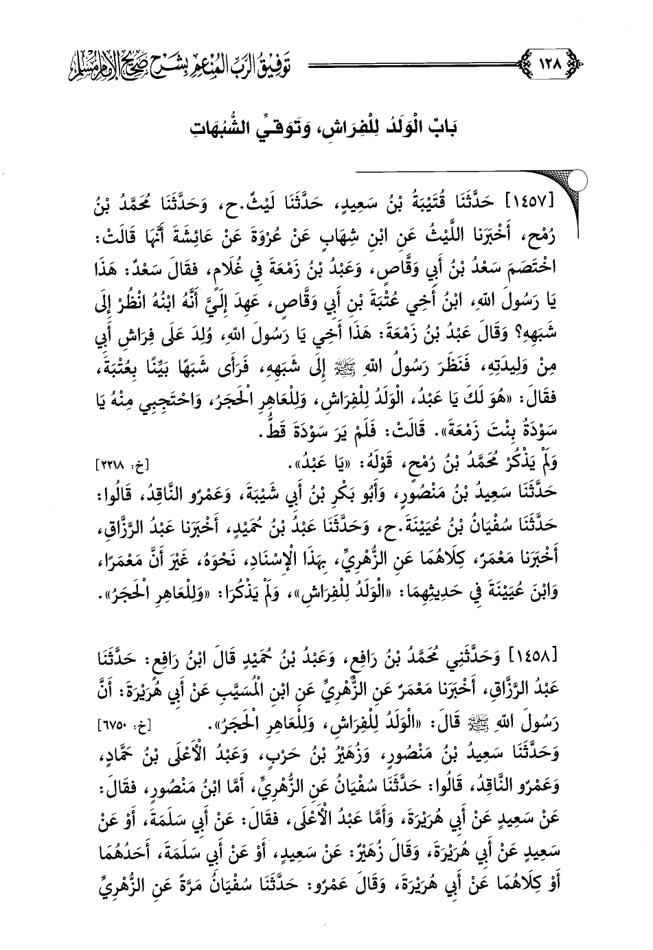 [١٤٥٧] حَدَّثَنَا قُتَيْبَةُ بْنُ سَعِيدٍ، حَدَّثَنَا لَيْثٌ. ح، وَحَدَّثَنَا مُحَمَّدُ بْنُ رُمْح، أَخْبَرَنا اللَّيْثُ عَنِ ابْنِ شِهَابٍ عَنْ عُرْوَةَ عَنْ عَائِشَةَ أَنَّهَا قَالَتْ: اخْتَصَمَ سَعْدُ بْنُ أَبِي وَقَّاصٍ، وَعَبْدُ بْنُ زَمْعَةَ فِي غُلَامٍ، فقَالَ سَعْدٌ: هَذَا يَا رَسُولَ اللهِ، ابْنُ أَخِي عُتْبَةَ بْنِ أَبِي وَقَّاصٍ، عَهِدَ إِلَيَّ أَنَّهُ ابْنُهُ انْظُرْ إِلَى شَبَهِهِ؟ وَقَالَ عَبْدُ بْنُ زَمْعَةَ: هَذَا أَخِي يَا رَسُولَ اللهِ، وُلِدَ عَلَى فِرَاشِ أَبِي مِنْ وَلِيدَتِهِ، فَنَظَرَ رَسُولُ اللهِ صلى الله عليه وسلم إِلَى شَبَهِهِ، فَرَأَى شَبَهًا بَيِّنًا بِعُتْبَةَ، فقَالَ: ((هُوَ لَكَ يَا عَبْدُ، الْوَلَدُ لِلْفِرَاشِ، وَلِلْعَاهِرِ الْحَجَرُ، وَاحْتَجِبِي مِنْهُ يَا سَوْدَةُ بِنْتَ زَمْعَةَ)). قَالَتْ: فَلَمْ يَرَ سَوْدَةَ قَطُّ.