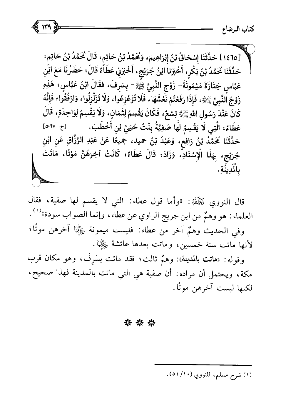 [١٤٦٥] حَدَّثَنَا إِسْحَاقُ بْنُ إِبْرَاهِيمَ، وَمُحَمَّدُ بْنُ حَاتِمٍ، قَالَ مُحَمَّدُ بْنُ حَاتِمٍ: حَدَّثَنَا مُحَمَّدُ بْنُ بَكْرٍ، أَخْبَرَنا ابْنُ جُرَيْجٍ، أَخْبَرَنِي عَطَاءٌ قَالَ: حَضَرْنَا مَعَ ابْنِ عَبَّاسٍ جَنَازَةَ مَيْمُونَةَ- زَوْجِ النَّبِيِّ صلى الله عليه وسلم- بِسَرِفَ، فقَالَ ابْنُ عَبَّاسٍ: هَذِهِ زَوْجُ النَّبِيِّ صلى الله عليه وسلم، فَإِذَا رَفَعْتُمْ نَعْشَهَا، فَلَا تُزَعْزِعُوا، وَلَا تُزَلْزِلُوا، وَارْفُقُوا؛ فَإِنَّهُ كَانَ عَنْدَ رَسُولِ اللهِ صلى الله عليه وسلم تِسْعٌ، فَكَانَ يَقْسِمُ لِثَمَانٍ، وَلَا يَقْسِمُ لِوَاحِدَةٍ، قَالَ عَطَاءٌ: الَّتِي لَا يَقْسِمُ لَهَا صَفِيَّةُ بِنْتُ حُيَيِّ بْنِ أَخْطَبَ.