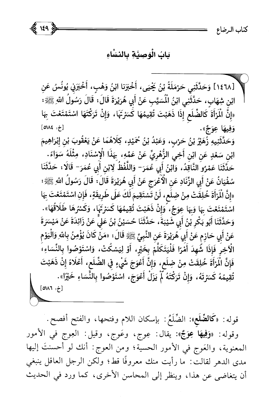 [١٤٦٨] وَحَدَّثَنِي حَرْمَلَةُ بْنُ يَحْيَى، أَخْبَرَنا ابْنُ وَهْبٍ، أَخْبَرَنِي يُونُسُ عَنِ ابْنِ شِهَابٍ، حَدَّثَنِي ابْنُ الْمُسَيَّبِ عَنْ أَبِي هُرَيْرَةَ قَالَ: قَالَ رَسُولُ اللهِ صلى الله عليه وسلم: ((إِنَّ الْمَرْأَةَ كَالضِّلَعِ إِذَا ذَهَبْتَ تُقِيمُهَا كَسَرْتَهَا، وَإِنْ تَرَكْتَهَا اسْتَمْتَعْتَ بِهَا وَفِيهَا عِوَجٌ)).