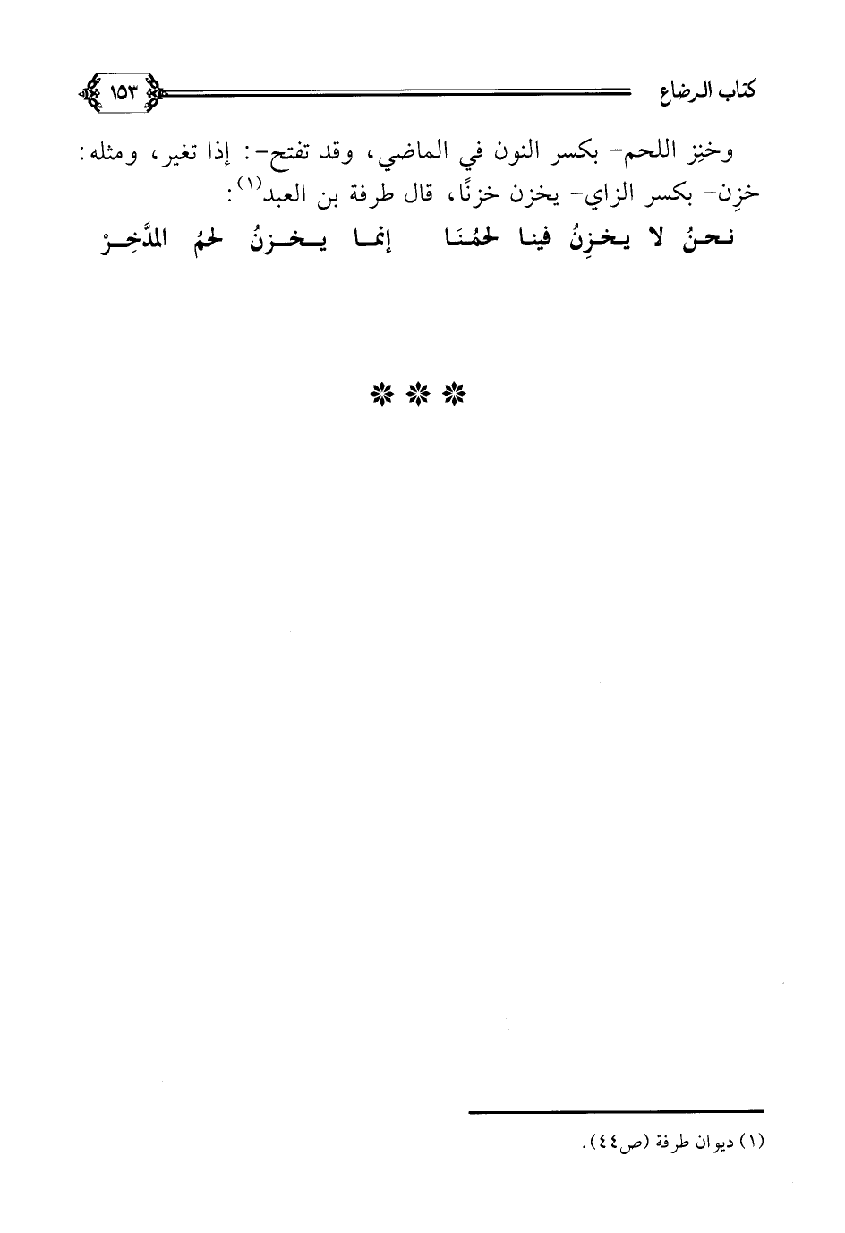 وخنِز اللحم- بكسر النون في الماضي، وقد تفتح-: إذا تغير، ومثله: خزِن- بكسر الزاي- يخزن خزنًا، قال طرفة بن العبد (¬١):