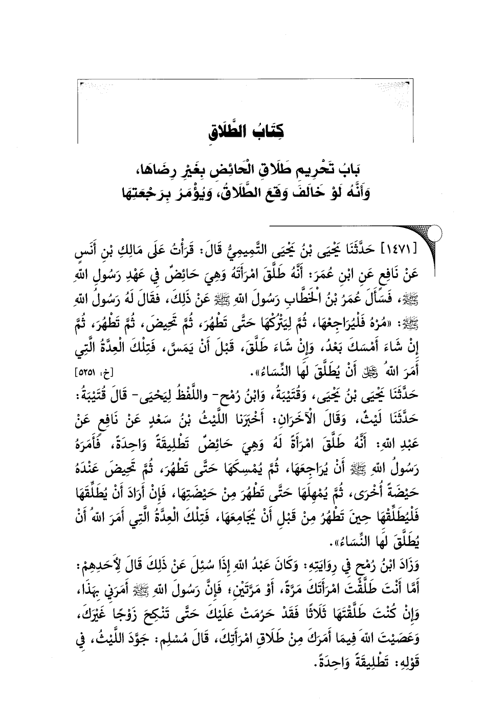 [١٤٧١] حَدَّثَنَا يَحْيَى بْنُ يَحْيَى التَّمِيمِيُّ قَالَ: قَرَأْتُ عَلَى مَالِكِ بْنِ أَنَسٍ عَنْ نَافِعٍ عَنِ ابْنِ عُمَرَ: ((أَنَّهُ طَلَّقَ امْرَأَتَهُ وَهِيَ حَائِضٌ فِي عَهْدِ رَسُولِ اللَّهِ صلى الله عليه وسلم، فَسَأَلَ عُمَرُ بْنُ الْخَطَّابِ رَسُولَ اللَّهِ صلى الله عليه وسلم عَنْ ذَلِكَ، فقَالَ لَهُ رَسُولُ اللَّهِ صلى الله عليه وسلم: مُرْهُ فَلْيُرَاجِعْهَا، ثُمَّ لِيَتْرُكْهَا حَتَّى تَطْهُرَ، ثُمَّ تَحِيضَ، ثُمَّ تَطْهُرَ، ثُمَّ إِنْ شَاءَ أَمْسَكَ بَعْدُ، وَإِنْ شَاءَ طَلَّقَ، قَبْلَ أَنْ يَمَسَّ، فَتِلْكَ الْعِدَّةُ الَّتِي أَمَرَ اللَّهُ عز وجل أَنْ يُطَلَّقَ لَهَا النِّسَاءُ)).
