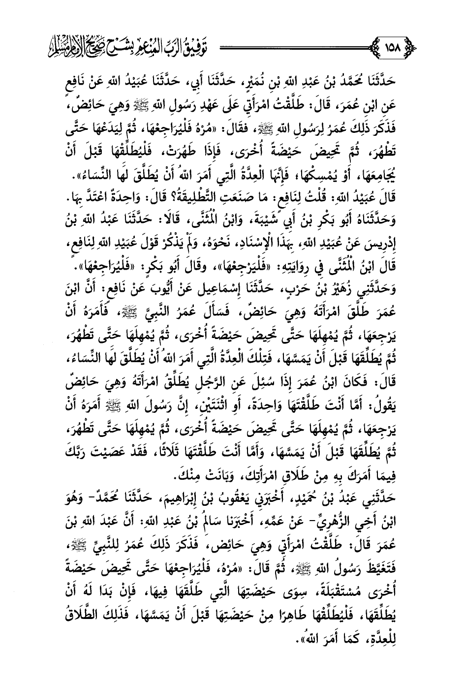 حَدَّثَنَا مُحَمَّدُ بْنُ عَبْدِ اللَّهِ بْنِ نُمَيْرٍ، حَدَّثَنَا أَبِي، حَدَّثَنَا عُبَيْدُ اللَّهِ عَنْ نَافِعٍ عَنِ ابْنِ عُمَرَ، قَالَ: ((طَلَّقْتُ امْرَأَتِي عَلَى عَهْدِ رَسُولِ اللَّهِ صلى الله عليه وسلم وَهِيَ حَائِضٌ، فَذَكَرَ ذَلِكَ عُمَرُ لِرَسُولِ اللَّهِ صلى الله عليه وسلم، فقَالَ: مُرْهُ فَلْيُرَاجِعْهَا، ثُمَّ لِيَدَعْهَا حَتَّى تَطْهُرَ، ثُمَّ تَحِيضَ حَيْضَةً أُخْرَى، فَإِذَا طَهُرَتْ، فَلْيُطَلِّقْهَا قَبْلَ أَنْ يُجَامِعَهَا، أَوْ يُمْسِكْهَا؛ فَإِنَّهَا الْعِدَّةُ الَّتِي أَمَرَ اللَّهُ أَنْ يُطَلَّقَ لَهَا النِّسَاءُ)).