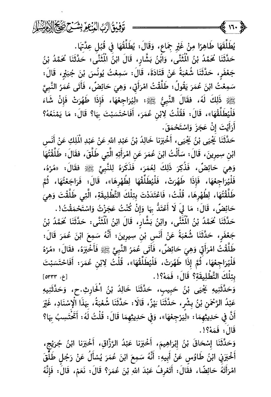 حَدَّثَنَا مُحَمَّدُ بْنُ الْمُثَنَّى، وابْنُ بَشَّارٍ، قَالَ ابْنُ الْمُثَنَّى: حَدَّثَنَا مُحَمَّدُ بْنُ جَعْفَرٍ، حَدَّثَنَا شُعْبَةُ عَنْ أَنَسِ بْنِ سِيرِينَ: أَنَّهُ سَمِعَ ابْنَ عُمَرَ قَالَ: ((طَلَّقْتُ امْرَأَتِي وَهِيَ حَائِضٌ، فَأَتَى عُمَرُ النَّبِيَّ صلى الله عليه وسلم فَأَخْبَرَهُ، فقَالَ: مُرْهُ فَلْيُرَاجِعْهَا، ثُمَّ إِذَا طَهُرَتْ، فَلْيُطَلِّقْهَا، قُلْتُ لِابْنِ عُمَرَ: أَفَاحْتَسَبْتَ بِتِلْكَ التَّطْلِيقَةِ؟ قَالَ: فَمَهْ؟ ! )).