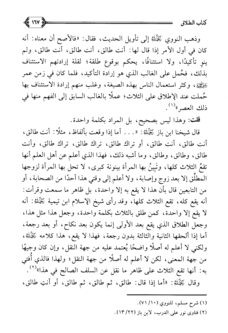 وذهب النووي رحمه الله إلى تأويل الحديث، فقال: ((فالأصح أن معناه: أنه كان في أول الأمر إذا قال لها: أنت طالق، أنت طالق، أنت طالق، ولم ينوِ تأكيدًا، ولا استئنافًا، يحكم بوقوع طلقة؛ لقلة إرادتهم الاستئناف بذلك، فحُمل على الغالب الذي هو إرادة التأكيد، فلما كان في زمن عمر رضي الله عنه، وكثر استعمال الناس بهذه الصيغة، وغلب منهم إرادة الاستئناف بها حُملت عند الإطلاق على الثلاث؛ عملًا بالغالب السابق إلى الفهم منها في ذلك العصر)) (¬١).