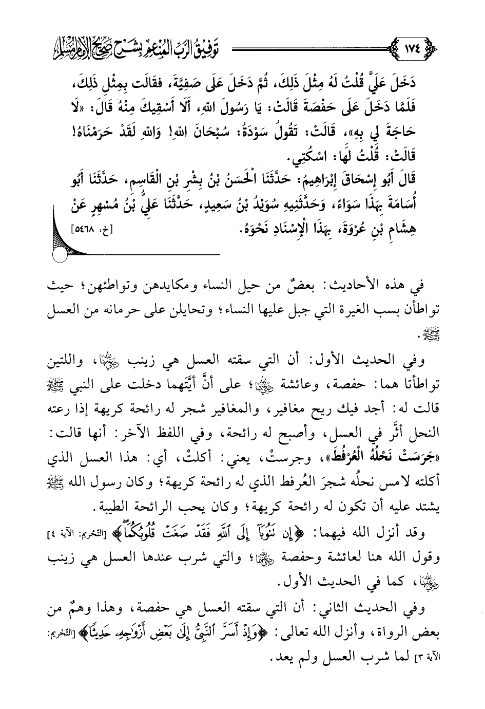 وقد أنزل الله فيهما: {إِن تَتُوبَا إِلَى اللَّهِ فَقَدْ صَغَتْ قُلُوبُكُمَا} وقول الله هنا لعائشة وحفصة رضي الله عنهما؛ والتي شرب عندها العسل هي زينب رضي الله عنها، كما في الحديث الأول.