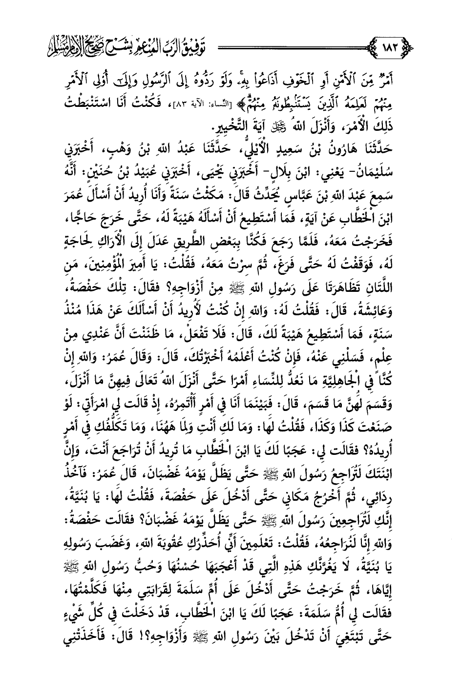 حَدَّثَنَا هَارُونُ بْنُ سَعِيدٍ الْأَيْلِيُّ، حَدَّثَنَا عَبْدُ اللَّهِ بْنُ وَهْبٍ، أَخْبَرَنِي سُلَيْمَانُ- يَعْنِي: ابْنَ بِلَالٍ- أَخْبَرَنِي يَحْيَى، أَخْبَرَنِي عُبَيْدُ بْنُ حُنَيْنٍ: أَنَّهُ سَمِعَ عَبْدَ اللَّهِ بْنَ عَبَّاسٍ يُحَدِّثُ قَالَ: ((مَكَثْتُ سَنَةً وَأَنَا أُرِيدُ أَنْ أَسْأَلَ عُمَرَ بْنَ الْخَطَّابِ عَنْ آيَةٍ، فَمَا أَسْتَطِيعُ أَنْ أَسْأَلَهُ هَيْبَةً لَهُ، حَتَّى خَرَجَ حَاجًّا، فَخَرَجْتُ مَعَهُ، فَلَمَّا رَجَعَ فَكُنَّا بِبَعْضِ الطَّرِيقِ عَدَلَ إِلَى الْأَرَاكِ لِحَاجَةٍ لَهُ، فَوَقَفْتُ لَهُ حَتَّى فَرَغَ، ثُمَّ سِرْتُ مَعَهُ، فَقُلْتُ: يَا أَمِيرَ الْمُؤْمِنِينَ، مَنِ اللَّتَانِ تَظَاهَرَتَا عَلَى رَسُولِ اللَّهِ صلى الله عليه وسلم مِنْ أَزْوَاجِهِ؟ فقَالَ: تِلْكَ حَفْصَةُ، وَعَائِشَةُ، قَالَ: فَقُلْتُ لَهُ: وَاللَّهِ إِنْ كُنْتُ لَأُرِيدُ أَنْ أَسْأَلَكَ عَنْ هَذَا مُنْذُ سَنَةٍ، فَمَا أَسْتَطِيعُ هَيْبَةً لَكَ، قَالَ: فَلَا تَفْعَلْ، مَا ظَنَنْتَ أَنَّ عَنْدِي مِنْ عِلْمٍ، فَسَلْنِي عَنْهُ، فَإِنْ كُنْتُ أَعْلَمُهُ أَخْبَرْتُكَ، قَالَ: وَقَالَ عُمَرُ: وَاللَّهِ إِنْ كُنَّا فِي الْجَاهِلِيَّةِ مَا نَعُدُّ لِلنِّسَاءِ أَمْرًا حَتَّى أَنْزَلَ اللَّهُ تَعَالَى فِيهِنَّ مَا أَنْزَلَ، وَقَسَمَ لَهُنَّ مَا قَسَمَ، قَالَ: فَبَيْنَمَا أَنَا فِي أَمْرٍ أَأْتَمِرُهُ، إِذْ قَالَت لِي امْرَأَتِي: لَوْ صَنَعْتَ كَذَا وَكَذَا، فَقُلْتُ لَهَا: وَمَا لَكِ أَنْتِ وَلِمَا هَهُنَا، وَمَا تَكَلُّفُكِ فِي أَمْرٍ أُرِيدُهُ؟ فقَالَت لِي: عَجَبًا لَكَ يَا ابْنَ الْخَطَّابِ مَا تُرِيدُ أَنْ تُرَاجَعَ أَنْتَ، وَإِنَّ ابْنَتَكَ لَتُرَاجِعُ رَسُولَ اللَّهِ صلى الله عليه وسلم حَتَّى يَظَلَّ يَوْمَهُ غَضْبَانَ، قَالَ عُمَرُ: فَآخُذُ رِدَائِي، ثُمَّ أَخْرُجُ مَكَانِي