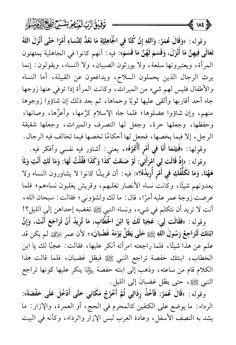 وقوله: ((وَقَالَ عُمَرُ: وَاللَّهِ إِنْ كُنَّا فِي الْجَاهِلِيَّةِ مَا نَعُدُّ لِلنِّسَاءِ أَمْرًا حَتَّى أَنْزَلَ اللَّهُ تَعَالَى فِيهِنَّ مَا أَنْزَلَ، وَقَسَمَ لَهُنَّ مَا قَسَمَ)): فيه: أنهم كانوا في الجاهلية يمتهنون المرأة، ويعتبرونها سلعة، ولا يورثون الصبيان، ولا النساء، ويقولون: إنما يرث الرجال الذين يحملون السلاح، ويدافعون عن القبيلة، أما النساء والأطفال فليس لهم شيء من الميراث، وكانت المرأة إذا توفي عنها زوجها جاء أحد أقاربها وألقى عليها ثوبًا وحماها، ثم بعد ذلك إن شاؤوا زوجوها منهم، وإن شاؤوا عضلوها؛ فلما جاء الإسلام كرَّمها، وأعزَّها، وصانها، وحفظها، وجعلها حرة، وجعل لها التصرف والميراث، وجعلها شقيقة الرجل، إلا فيما يخصها، فجعل لها أحكامًا تخصها فيما تخالف فيه الرجال.